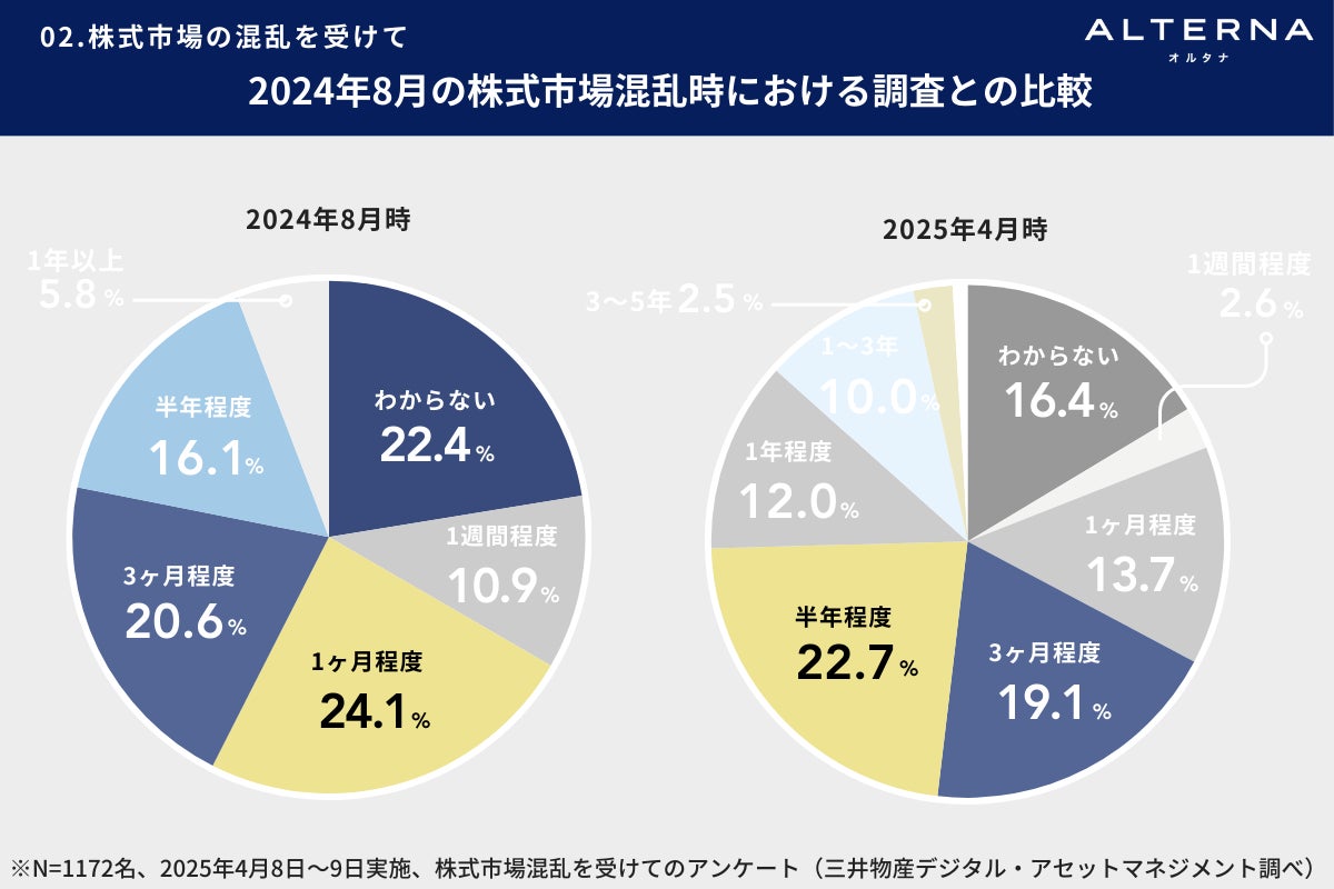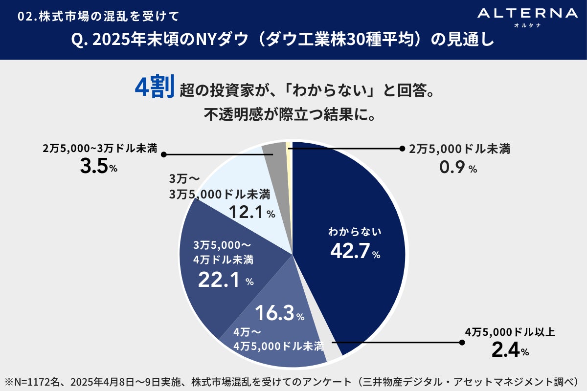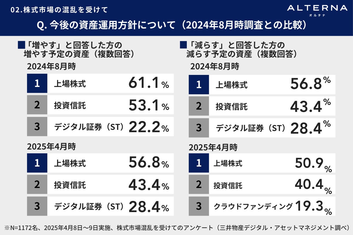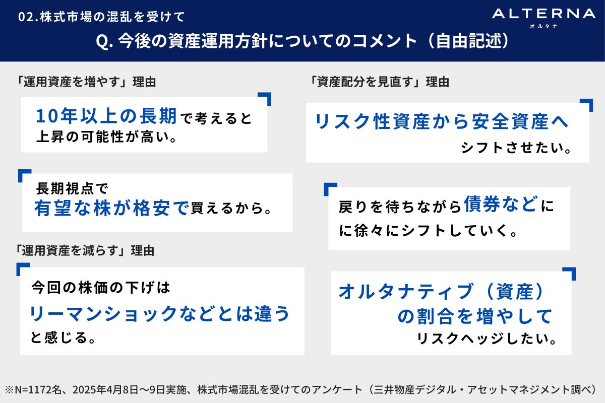 デジタル証券を活用した安定資産投資サービス「ALTERNA(オルタナ)」を提供する三井物産デジタル・アセットマネジメント株式会社(以下「当社」)は、先週からの株式市場や為替等の大幅な変動を受け、個人投資家における投資姿勢についてアンケートを実施しましたのでお知らせします。