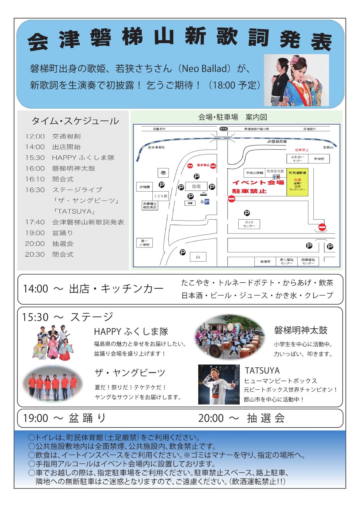 当日は、磐梯町民運動場周辺の一部が12時00分~21時30分まで車両通行止めとなります。ご迷惑をお掛けしますが、ご協力をお願いいたします。