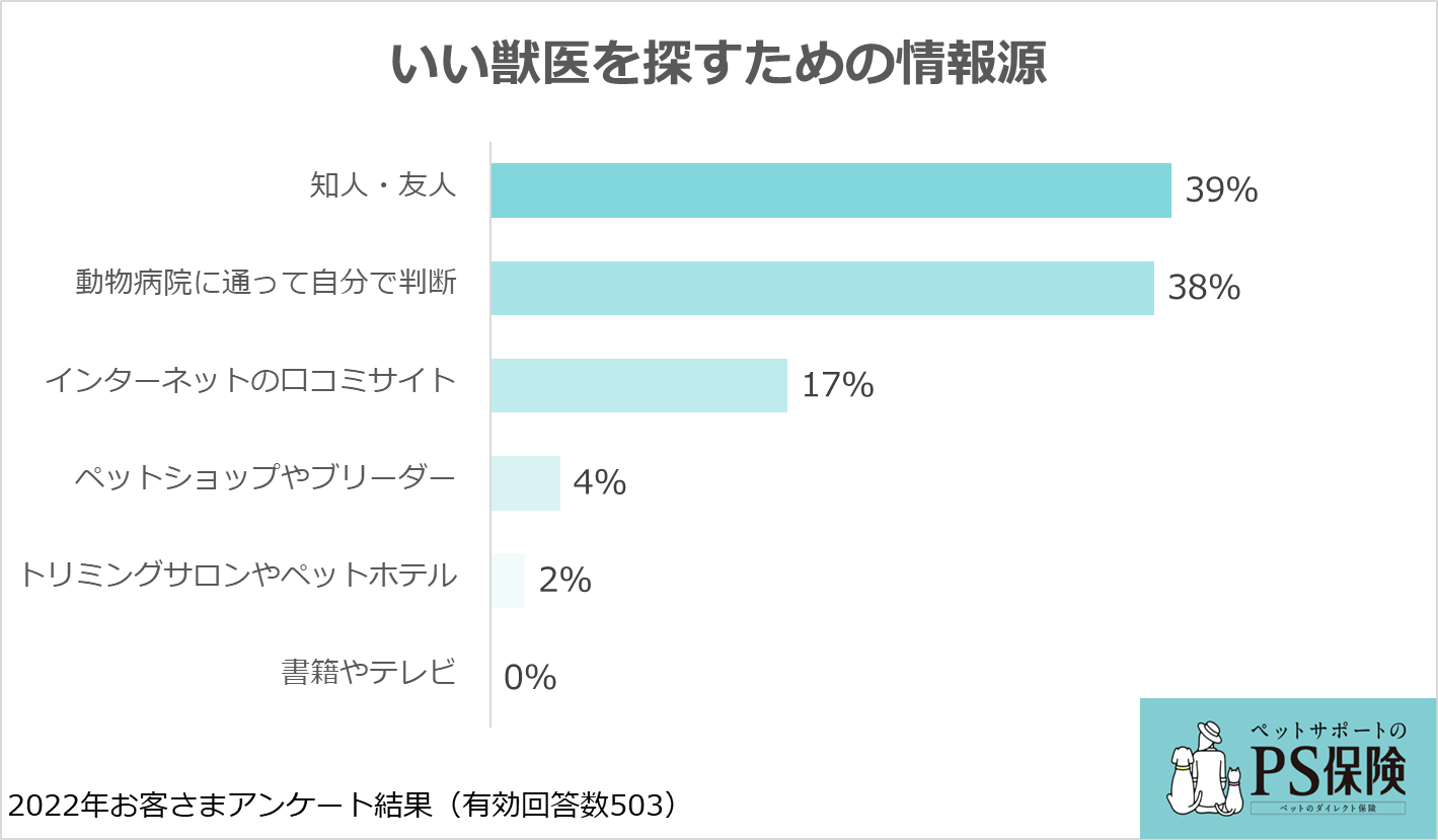 - いい獣医を探すための情報源は「知人・友人」(39%)が最多。「動物病院に通って自分で判断」(38%)が続く