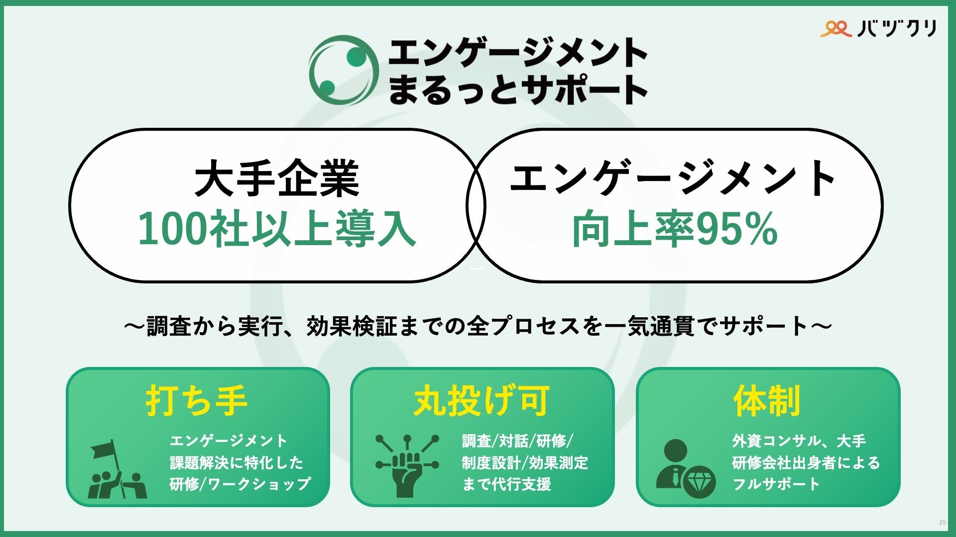 企業の人的資本経営が加速する中で、バヅクリは「エンゲージメント向上」や「離職防止」にとどまらず、組織の在り方そのものを変える伴走型の変革パートナーとして選ばれています。