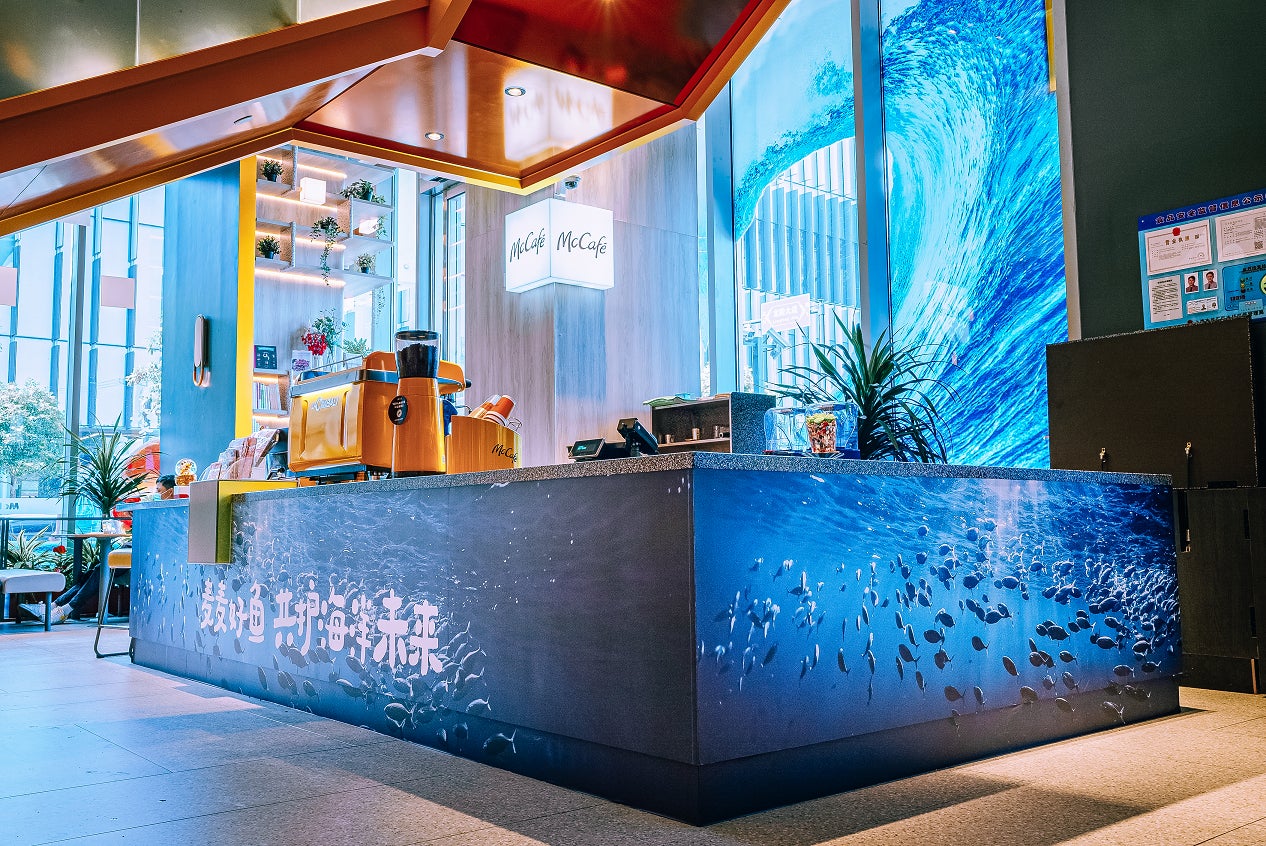 2023年6月8日(木)の世界海洋デーに行われた発表を記念して、マクドナルドの上海龍騰大道店では、お客様に海にいるかのように感じていただけるようなディスプレーが施されました。また、新たにMSCラベルが付いた製品を購入したお客様には、海洋プラスチックを再生利用した魚の形のキーホルダーがプレゼントされました(写真参照)。
