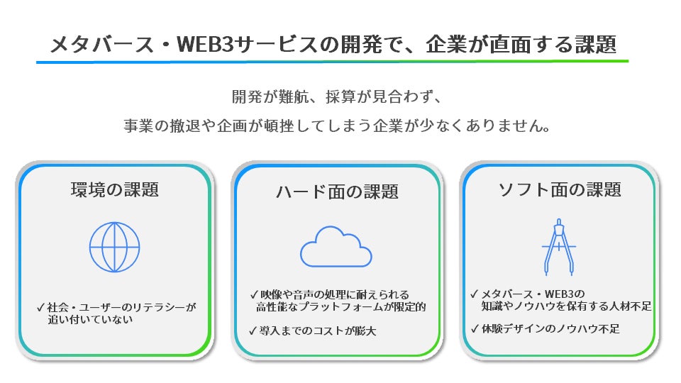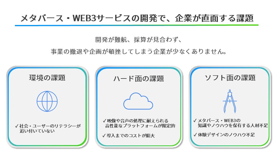 しかしながら、企業がメタバース・Web3事業に参入する上で、以下のような課題も散見されます。