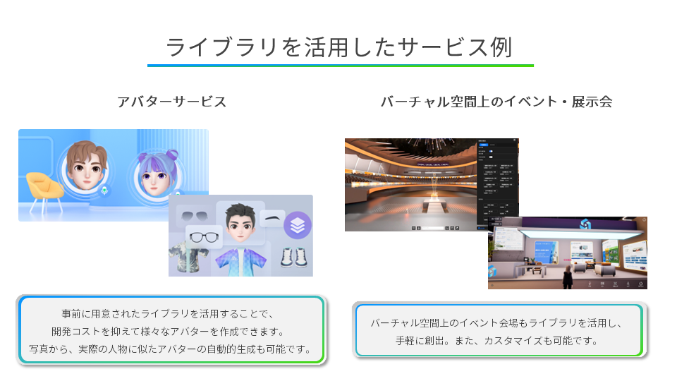 本ソリューションを活用することで、WEB3・メタバースを中心としたサービス実装はもちろんのこと、大規模な3D/XRを活かしたゲームやライブ配信サービス等のサービスも、ライブラリを活用することで実装がフルスクラッチ開発に比べて低コスト・スピーディに開発することができます。