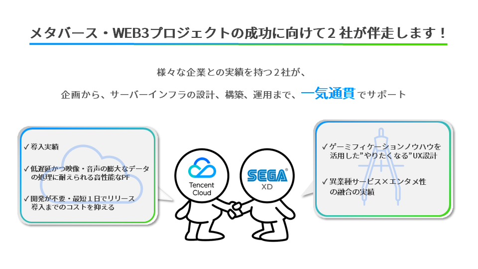 今回の「 Tencent Cloud 」の活用と、セガXDが保有する、エンタテインメントに関する事業ノウハウや一気通貫に行うプロジェクト推進力を組み合わせることで、サーバーインフラの設計、構築、運用までを一気通貫で支援します。