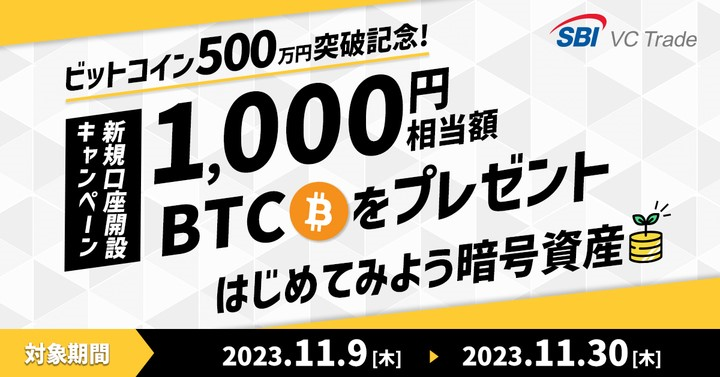 SBI VCトレード株式会社(本社:東京都港区、代表取締役社長:近藤 智彦、以下「当社」)は、2023年11月9日(木)より、「【ビットコイン500万円突破記念!】新規口座開設キャンペーン ~1,000円相当額のビットコインをプレゼント!はじめてみよう暗号資産~」を実施することをお知らせいたします。