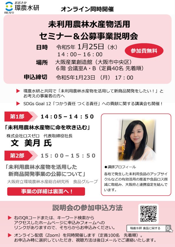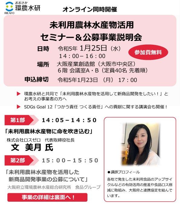 もったいない食品を活かし、エシカルな消費スタイルを創造する株式会社ロスゼロ(大阪市西区)の代表・文美月は、1月25日(水)に独立行政法人・大阪府立環境農林水産総合研究所(以下:環農水研)が主催する「未利用農林差異産物活用セミナー&公募事業説明会」第一部に登壇します。「未利用農林水産物に新しい命を吹き込む」と題し、資源を活かして循環させる自社のアップサイクル事例をもとに、食品開発のポイントや、個人や企業が食品ロス削減を通してSDGsに貢献する意義について話します。