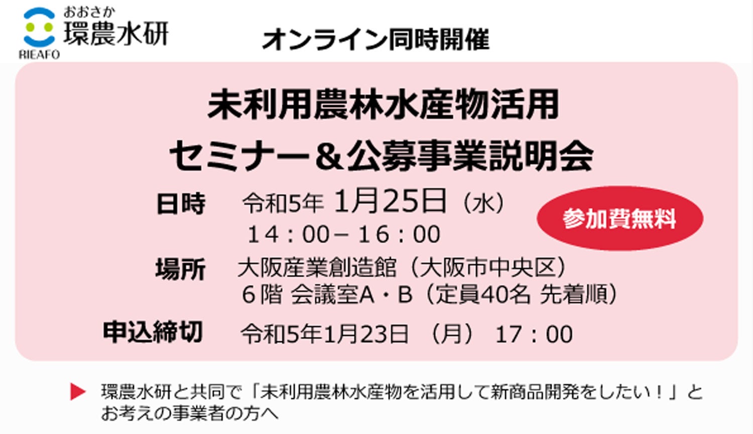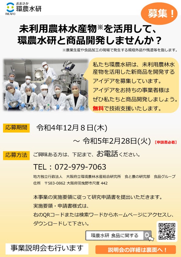 環農水研では新商品の開発に取り組む事業者を技術面でサポートする「テーマ設定型共同研究事業」を実施しており、今回「未利用農林水産物を活用した新商品開発」の計画を持つ農業・食品関連事業者を募集します。なお、採択されると研究所のシーズや加工機器・分析機器などを活用して共同で課題を解決し、新商品を開発することができます。以下の概要で当事業の説明会及び未利用農林差異産物活用セミナーが開催されます。