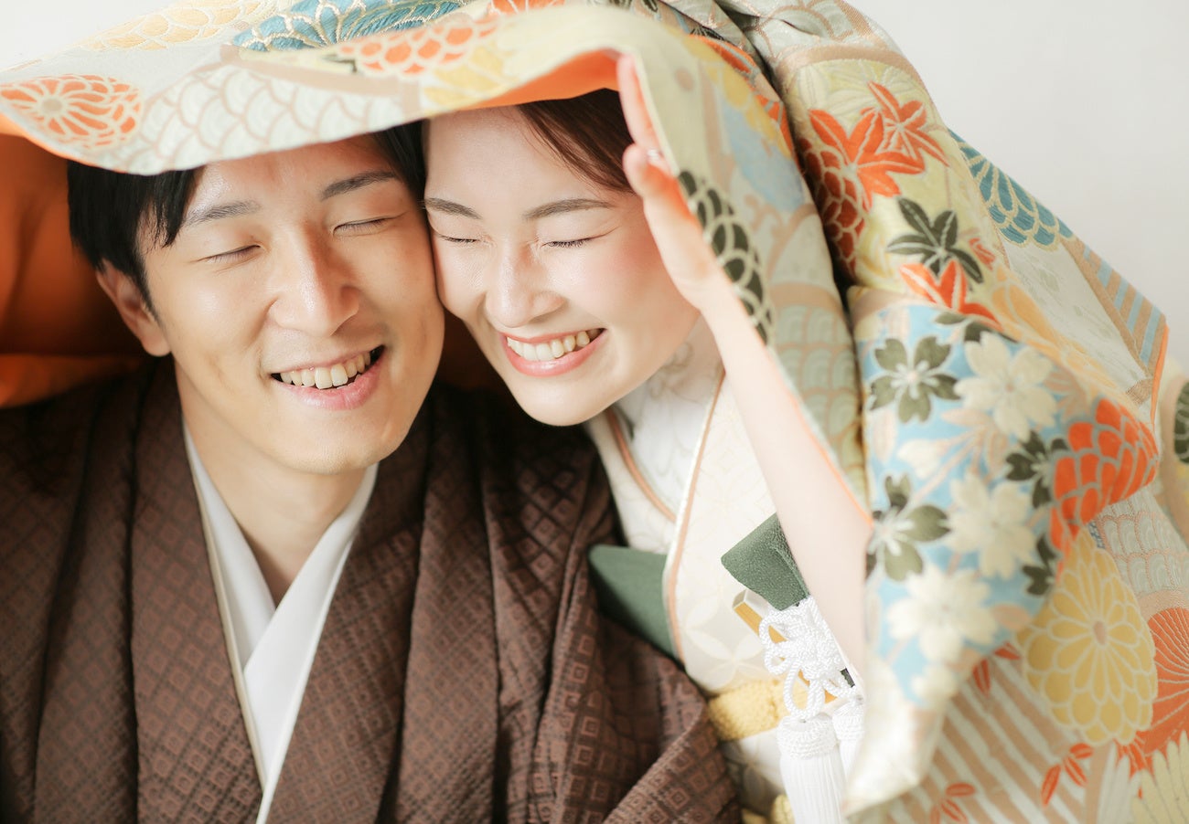 「せっかくなら新しくて、楽しいことがしたい!雨の日、和装ならどうする?打掛被ってみましょうか!どんな無茶振りでも全力で楽しんだ2人です。」