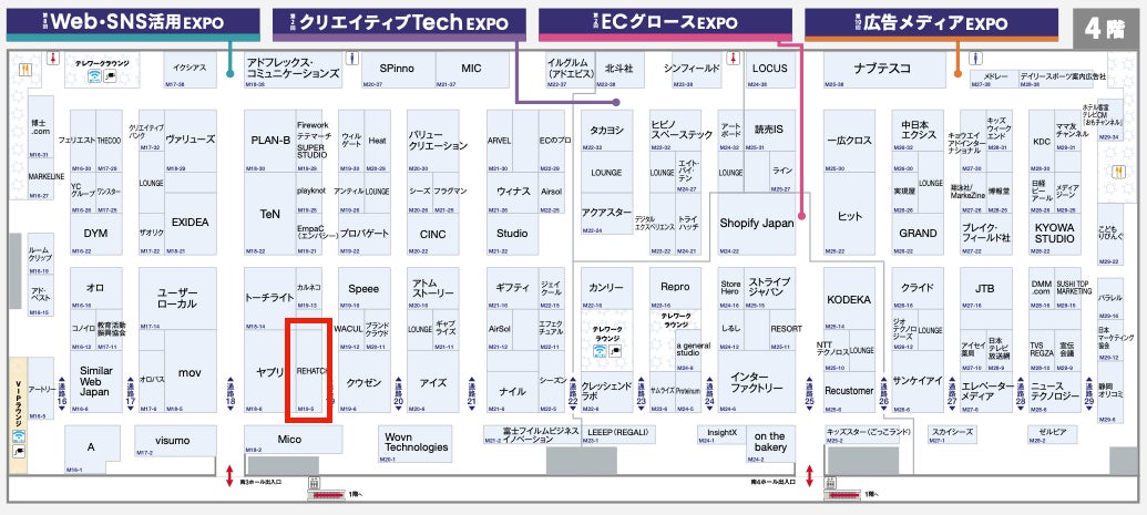 出展位置は、以下の通りになります。赤色の箇所が弊社のブース(ブース番号:M19-5)となります。
