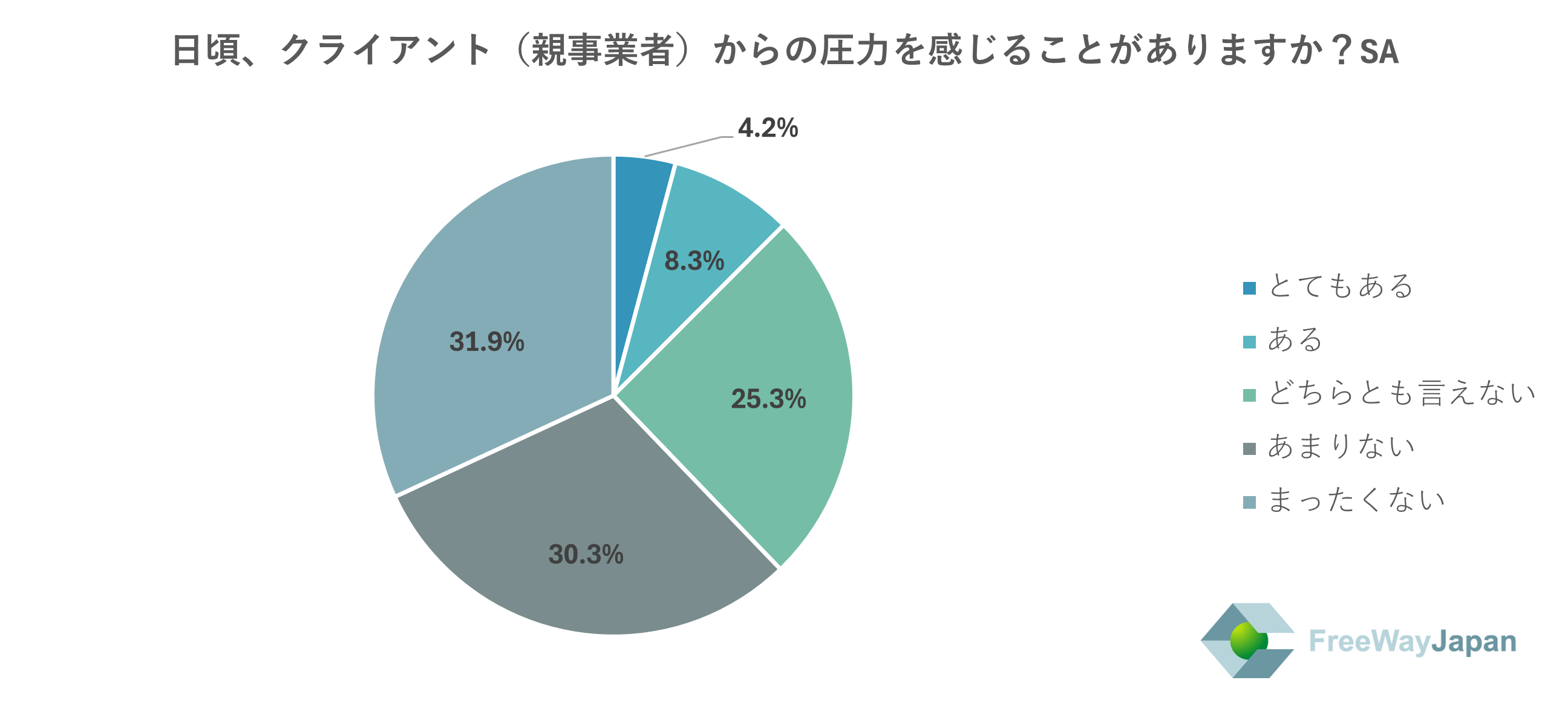 日頃、クライアント(親事業者)からの圧力を感じることがあるか聞いたところ、「まったくない」が31.9%、「あまりない」が30.3%、「どちらとも言えない」が25.3%、「ある」が8.3%、「とてもある」が4.2%という結果だった。