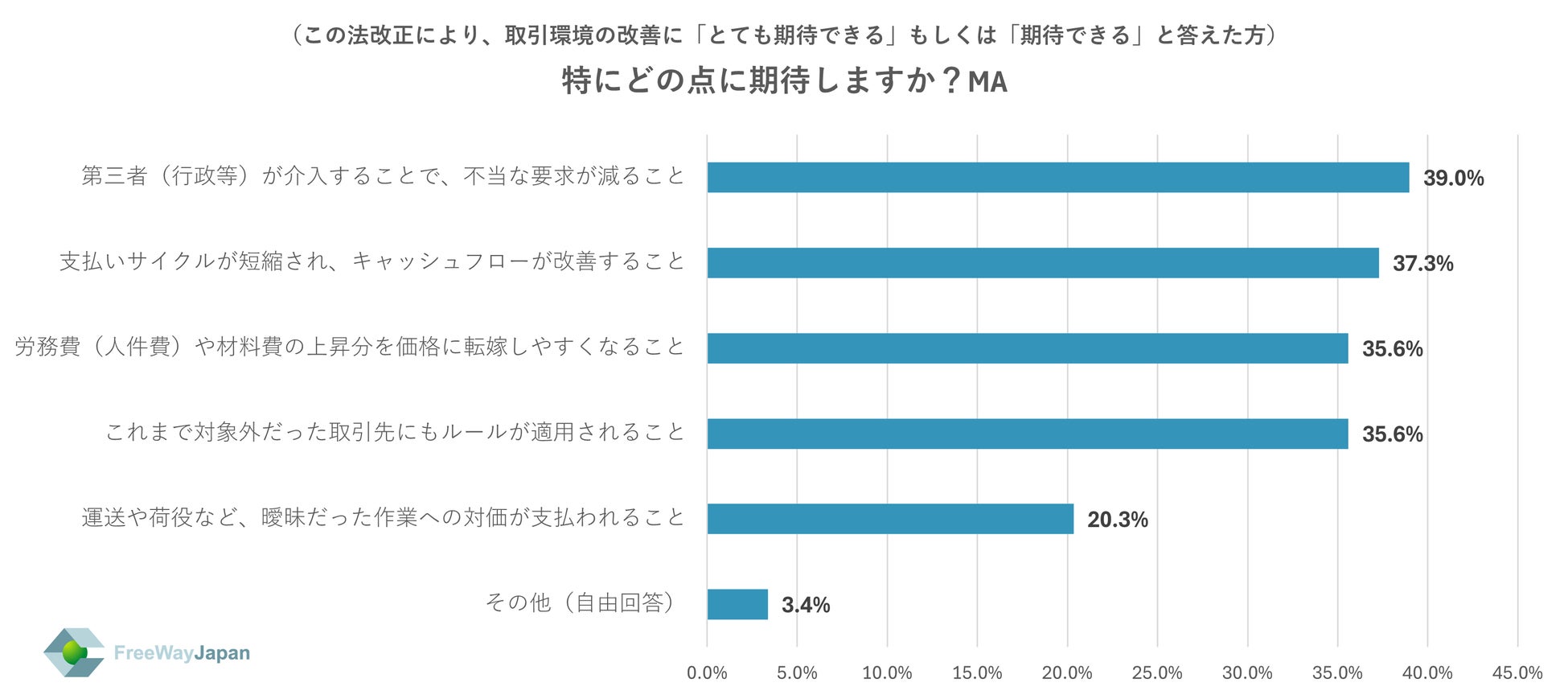 この法改正により、取引環境の改善に「とても期待できる」「期待できる」と答えた方に、特にどの点に期待するか聞いたところ、「第三者(行政等)が介入することで、不当な要求が減ること」が39.0%、「支払いサイクルが短縮され、キャッシュフローが改善すること」が37.3%、「これまで対象外だった取引先にもルールが適用されること」「労務費(人件費)や材料費の上昇分を価格に転嫁しやすくなること」がそれぞれ35.6%、「運送や荷役など、曖昧だった作業への対価が支払われること」20.3%、「その他(自由回答)」が3.4%という結果だった。