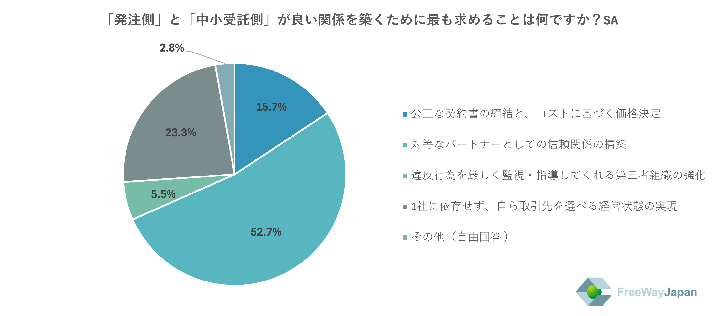 「発注側」と「中小受託側」が良い関係を築くために最も求めることは何か聞いたところ、「対等なパートナーとしての信頼関係の構築」が52.7%、「1社に依存せず、自ら取引先を選べる経営状態の実現」が23.3%、「公正な契約書の締結と、コストに基づく価格決定」が15.7%、「違反行為を厳しく監視・指導してくれる第三者組織の強化」が5.5%、「その他(自由回答)」が2.8%という結果だった。