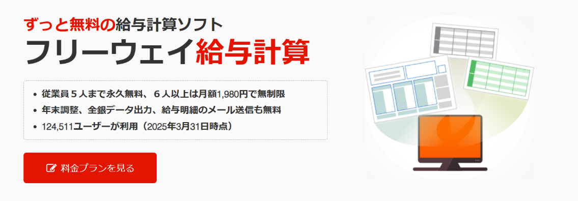 フリーウェイ給与計算は、5人まで永久無料、6人以上(無制限)は月額1,980円でご利用いただける給与計算ソフトです。