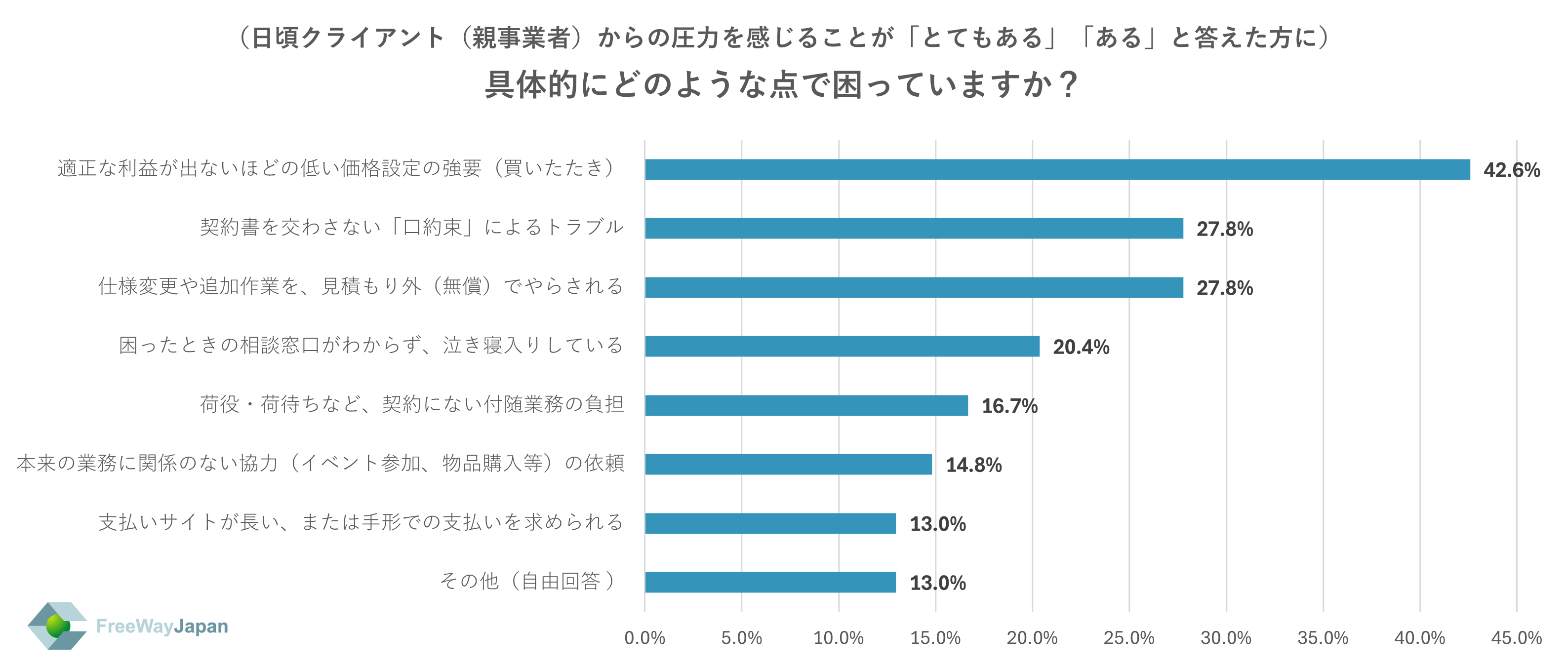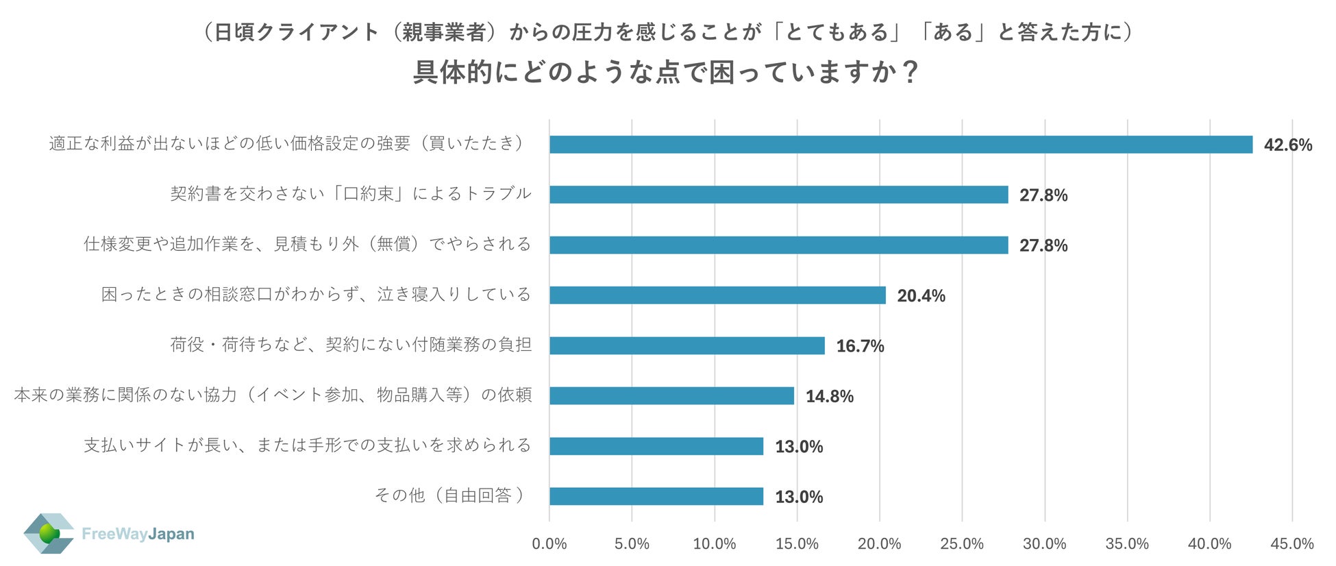 また、上記で「とてもある」「ある」と答えた方に、具体的にどのような点で困っているか聞いたところ、「適正な利益が出ないほどの低い価格設定の強要(買いたたき)」が42.6%、「契約書を交わさない「口約束」によるトラブル」「仕様変更や追加作業を、見積もり外(無償)でやらされる」がそれぞれ27.8%、「困ったときの相談窓口がわからず、泣き寝入りしている」が20.4%、「荷役・荷待ちなど、契約にない付随業務の負担」が16.7%、「本来の業務に関係のない協力(イベント参加、物品購入等)の依頼」が14.8%、「支払いサイトが長い、または手形での支払いを求められる」「その他(自由回答)」が13.0%という結果だった。