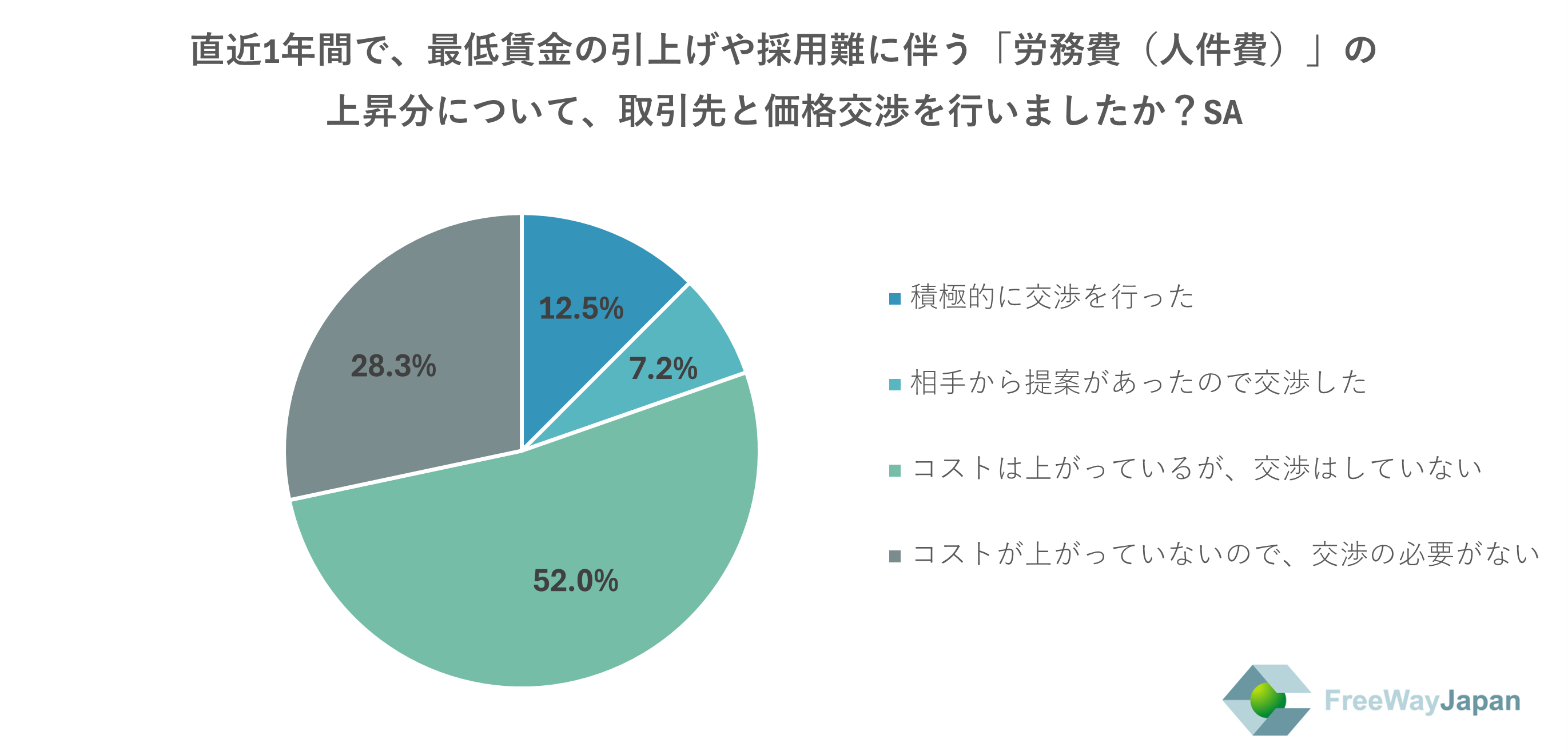 直近1年間で、最低賃金の引上げや採用難に伴う「労務費(人件費)」の上昇分について、取引先と価格交渉を行ったか聞いたところ、「コストは上がっているが、交渉はしていない」が52.0%、「コストが上がっていないので、交渉の必要がない」が28.3%、「積極的に交渉を行った」が12.5%、「相手から提案があったので交渉した」が7.2%という結果だった。