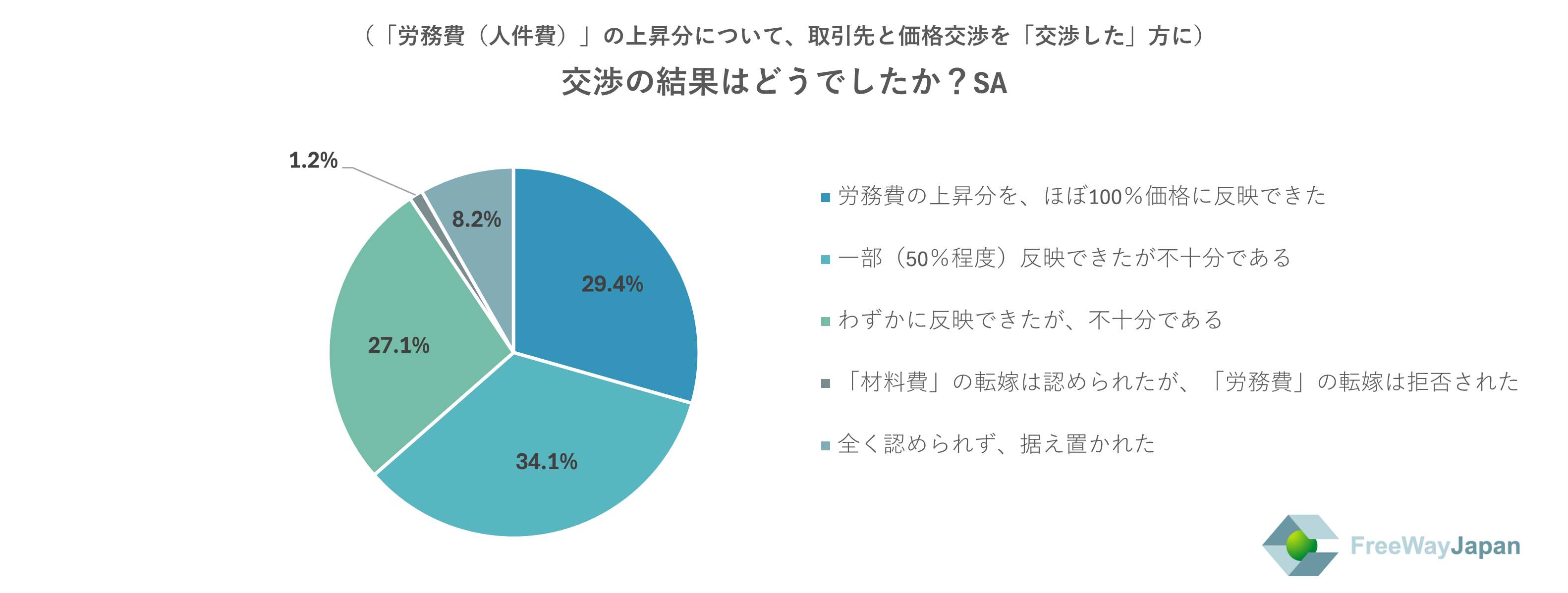 上記で「交渉した」と回答した方に、交渉の結果を聞いたところ、「一部(50%程度)反映できたが不十分である」が34.1%、「労務費の上昇分を、ほぼ100%価格に反映できた」が29.4%、「わずかに反映できたが、不十分である」が27.1%、「全く認められず、据え置かれた」が8.2%、「「材料費」の転嫁は認められたが、「労務費」の転嫁は拒否された」が1.2%という結果だった。