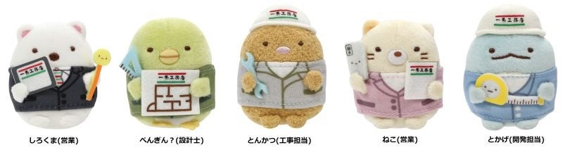 すみっコぐらしの人気キャラクター「しろくま」「ぺんぎん?」「とんかつ」「ねこ」「とかげ」の5体が、一条工務店の営業、設計士、開発担当、工事担当のスタッフに扮し、それぞれの職種を表すユニフォームと、タブレットや図面、工具などの専用アイテムを身に着けた、かわいらしい手のひらサイズのぬいぐるみです。それぞれに一条工務店のロゴが入った完全オリジナル仕様となっています。