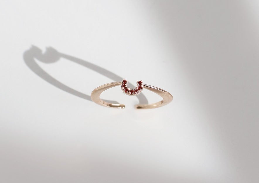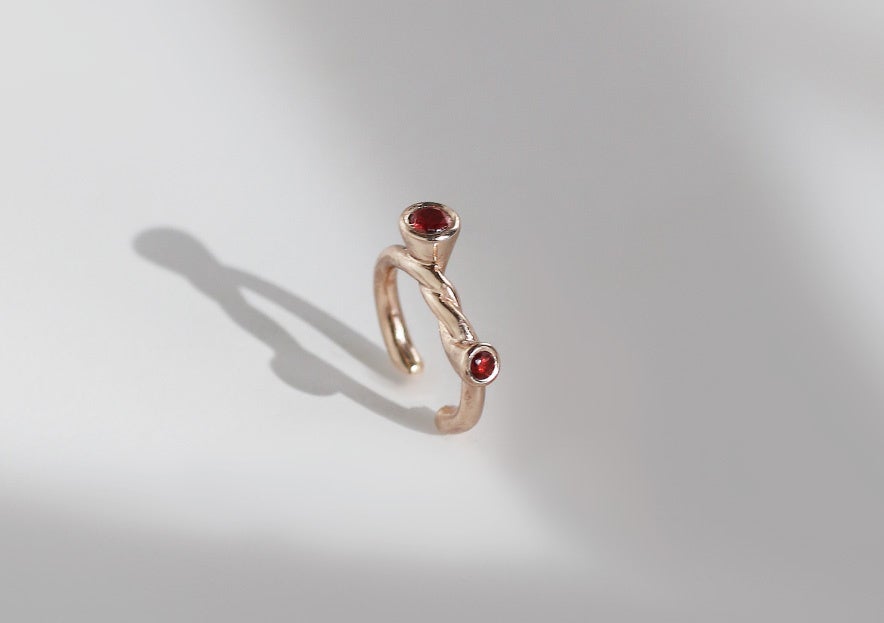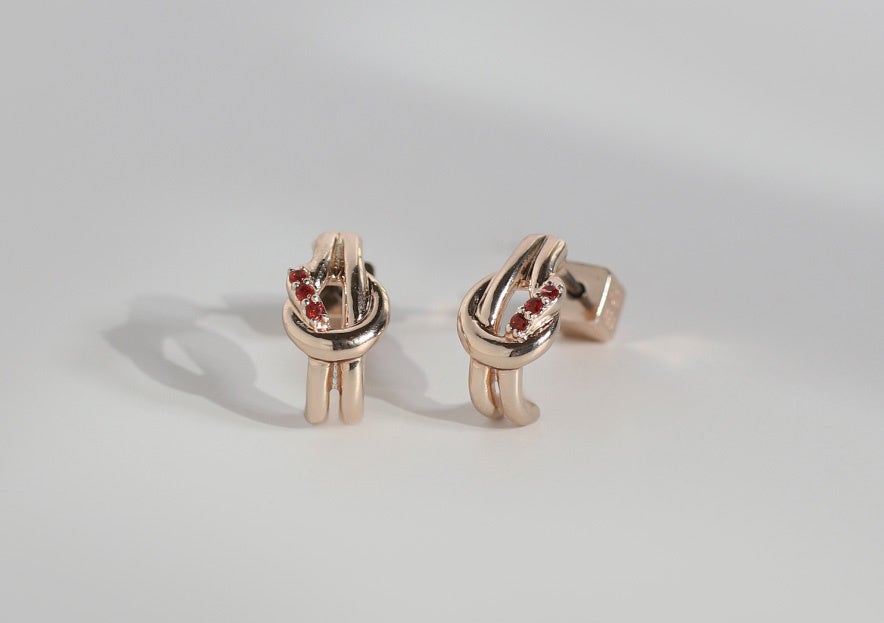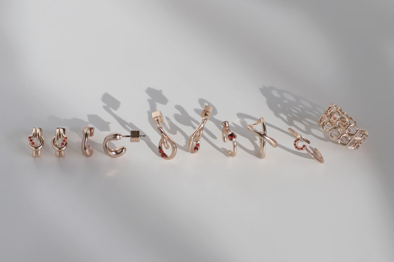 ニュアンスラインのピアスやイヤーカフ、チェーンやノットを取り入れたカジュアル使いにもおすすめなラインナップ。レッドのストーンで表現するロマンチックで、エネルギーを感じさせる印象が、つける人そのものの魅力を引き出してくれる。