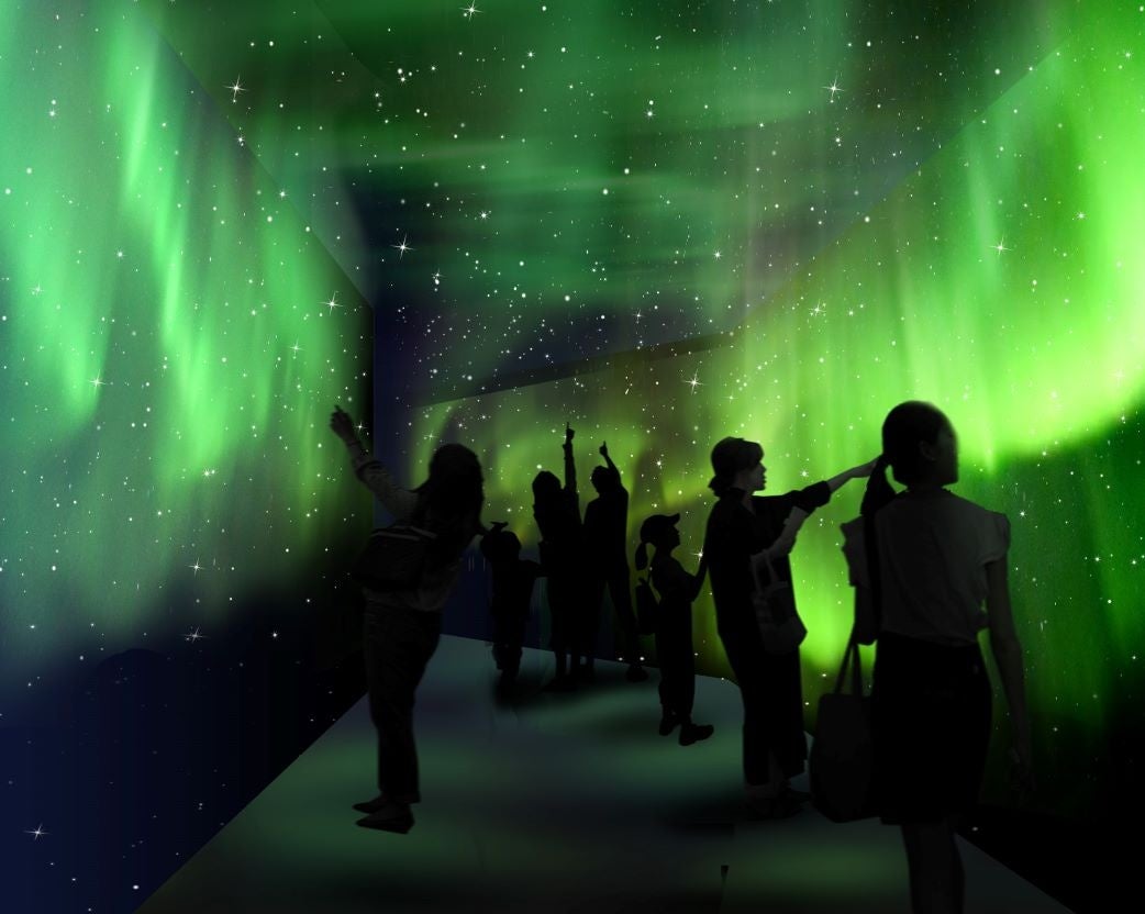 展示エリアの最後には、頭上いっぱいに広がるオーロラの光に包まれながら歩く、特別な “帰り道” が待っています。ゆらめく緑のカーテンが道を照らし、まるで極夜の南極をひとり占めしているような幻想的な空間です。映像と光が織りなすドラマチックな演出で、南極観測体験の余韻を美しく締めくくります。