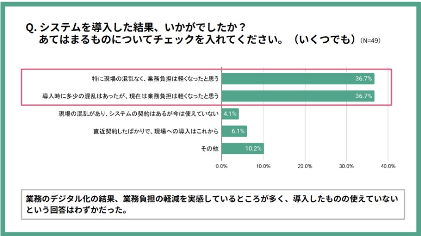 4) 業務のデジタル化の結果、業務負担の軽減を4割近くが実感しており、導入後の不満についての回答は1割満たなかった。ノンデスク業界においては、システム導入後のつまずきが多く定着が課題、というイメージが先行しているが、比較的受け入れられているケースが多いことが分かった。