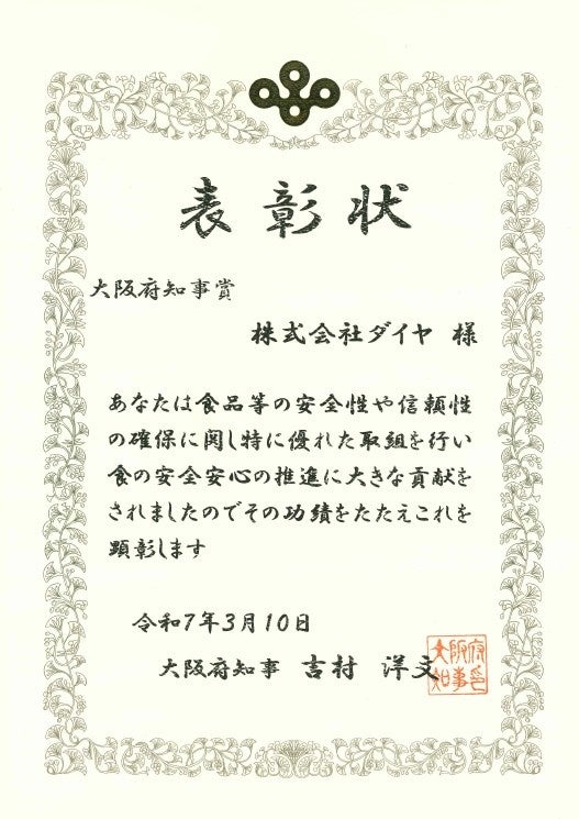 今年創業79周年の株式会社ダイヤ(本社:⼤阪市⽣野区新今⾥/代表取締役社長:多⽥俊介/以下ダイヤ)は、微生物検査の内製化や社内の衛生教育体制、学校教育教材の副読本などでの地域の学校教育への取組が評価され、食の安全安心の確保に関し特に優れた取組を評価する「大阪府食の安全安心顕彰制度」において大阪府知事賞を取得しました。