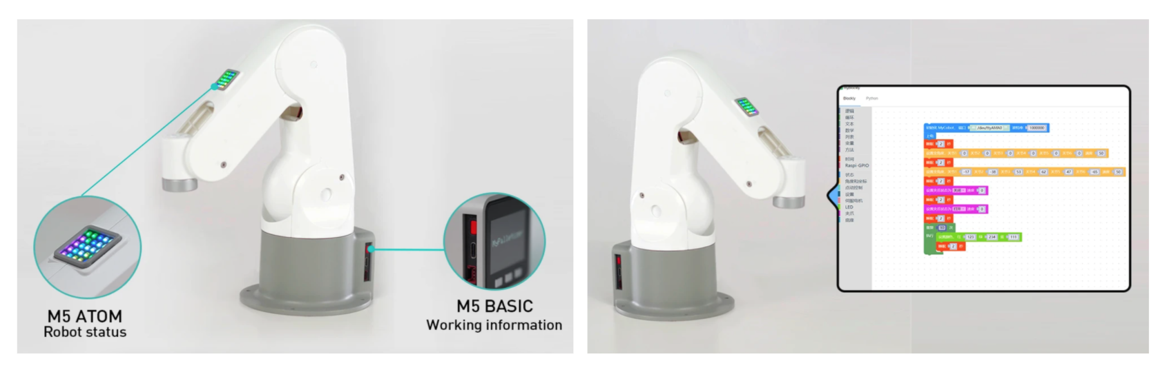 「myPalletizer」は、M5Stackシリーズを制御用マイコンに採用した小型・軽量・安価な4軸ロボットアームで、PythonやROS、ArduinoだけでなくRoboflow等のブロックプログラミングにも対応しており、研究開発や教育などの用途に最適です。また、好評販売中の6軸ロボットアーム「myCobot 280」と比べると、サーボモーターの数が減った分、自由度と作業半径が減りましたが、安価かつブレが少ない動作の再現が可能です。