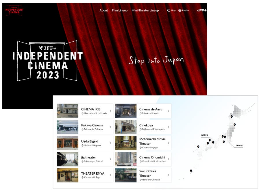 国際交流基金はこれまで、文化芸術交流事業の一環として、世界各国で日本映画を訴求する施策を展開してきました。2022年には、コロナ禍ということもあり「JFF+ INDEPENDENT CINEMA」として、日本の映画文化の根幹を支えるミニシアターを紹介しつつインディペンデント映画を配信するイベントがオンライン開催され、その第二弾として2023年、「JFF+ INDEPENDENT CINEMA 2023」の開催が決定しました。2000年代以降に誕生した新しいミニシアターにスポットを当てた英語と日本語での特設サイトを、ARIが海外に通用するUI/UXデザインで構築支援しました。