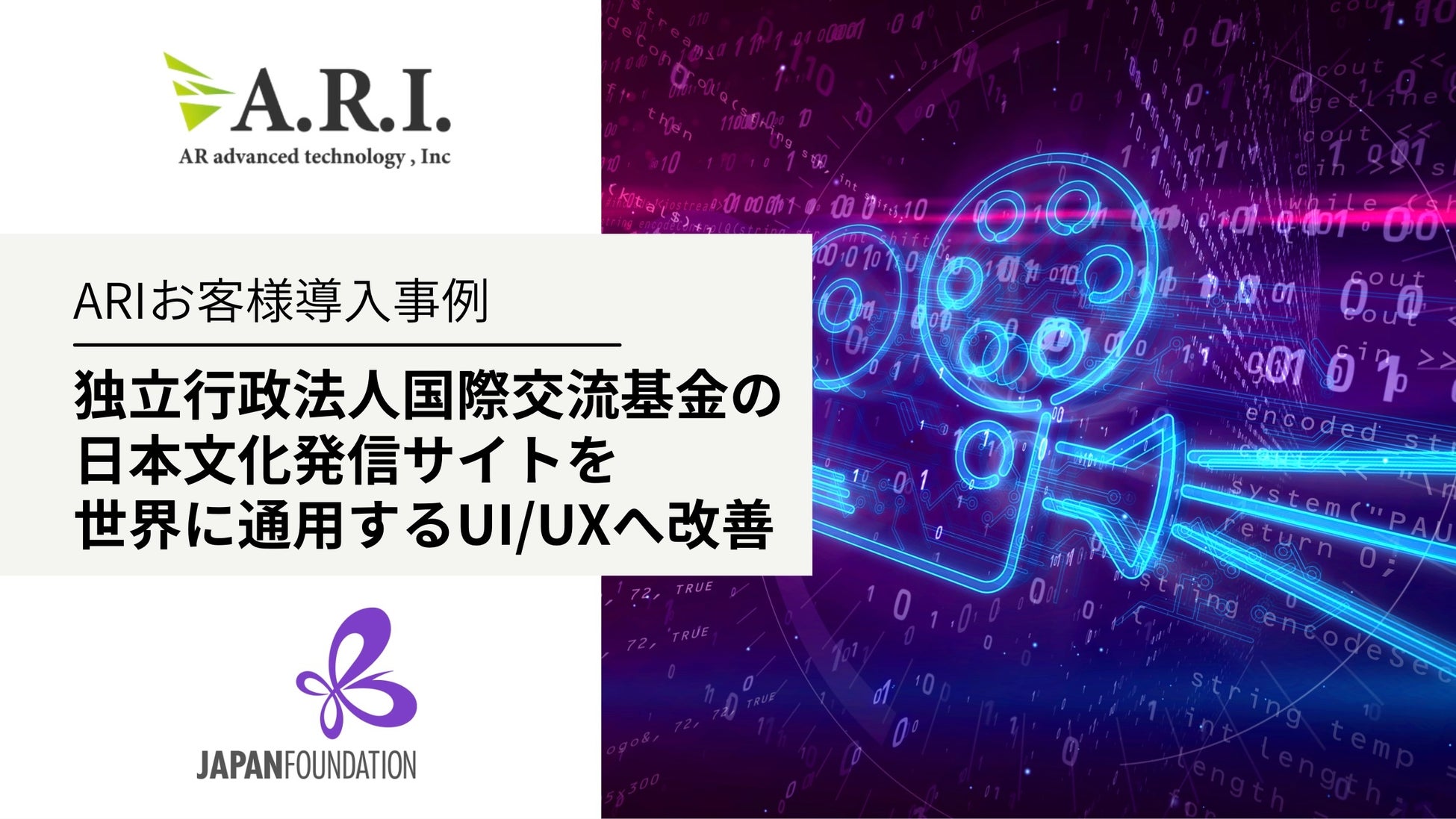ARアドバンストテクノロジ株式会社(本社:東京都渋谷区、代表取締役社長:武内 寿憲、以下ARI)は、独立行政法人国際交流基金(本社:東京都新宿区、理事長:黒澤 信也、以下国際交流基金)が提供する国際的な日本文化発信サイトの構築支援をおこない、本事例に関するインタビュー記事を公開したことをお知らせいたします。