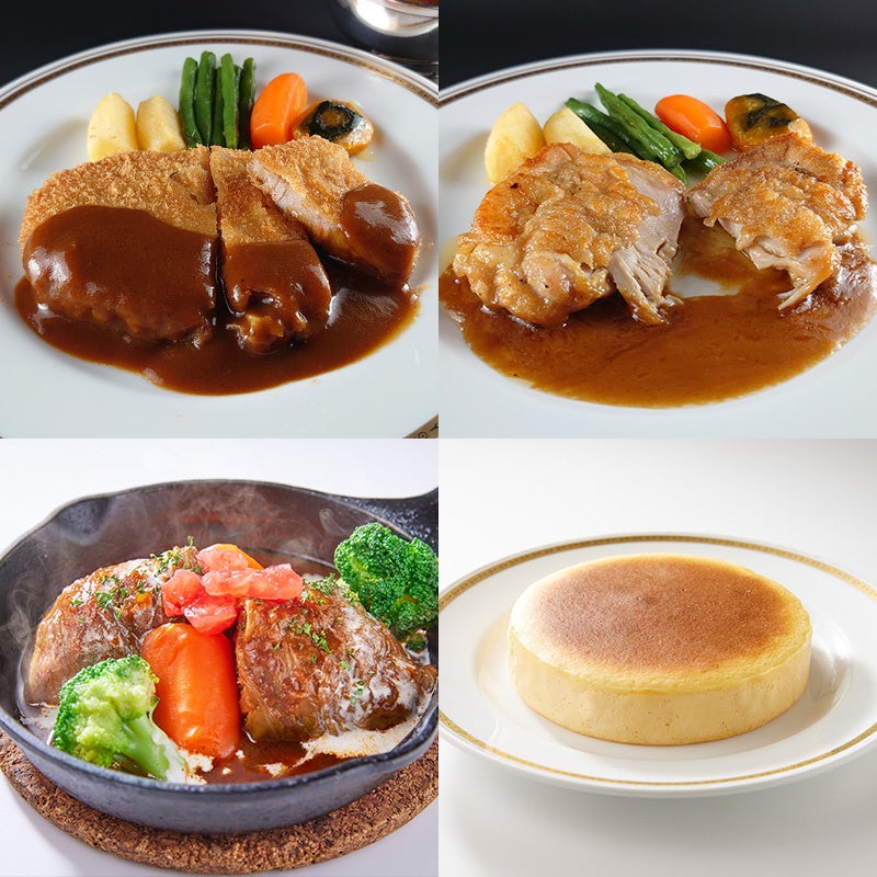 〈みかわや〉のポークカツレット、チキンソテーと〈日東コーナー〉のロールキャベツ、〈ピエスモンテ〉のチーズケーキのセット