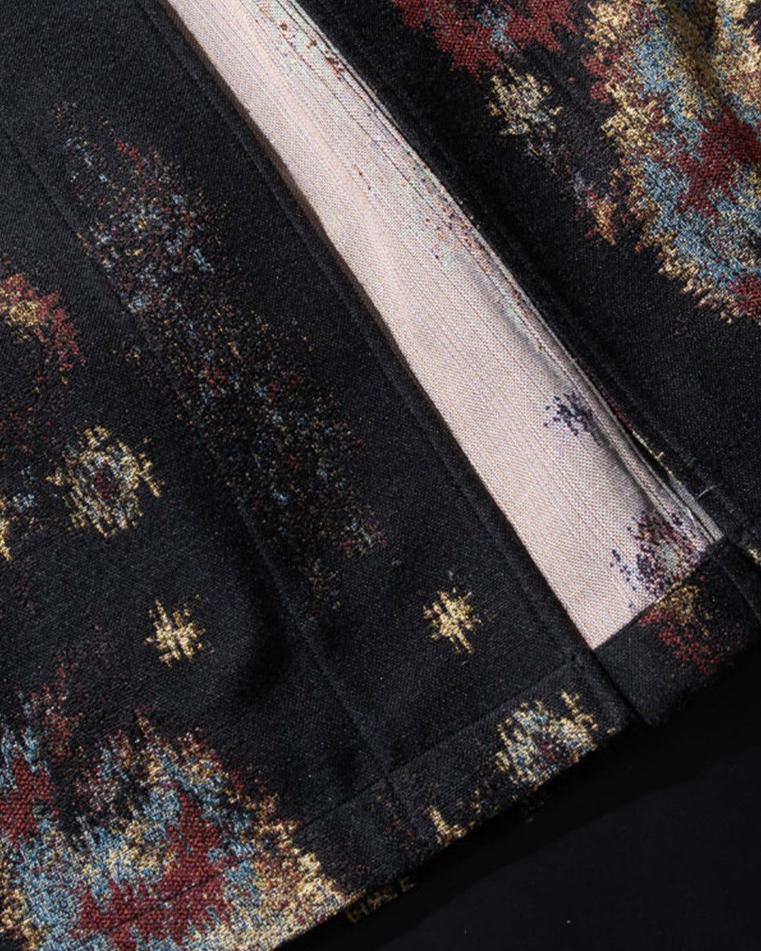大胆な柄を引き立てるシンプルなデザインで、上品さと存在感を兼ね備えた一着です。