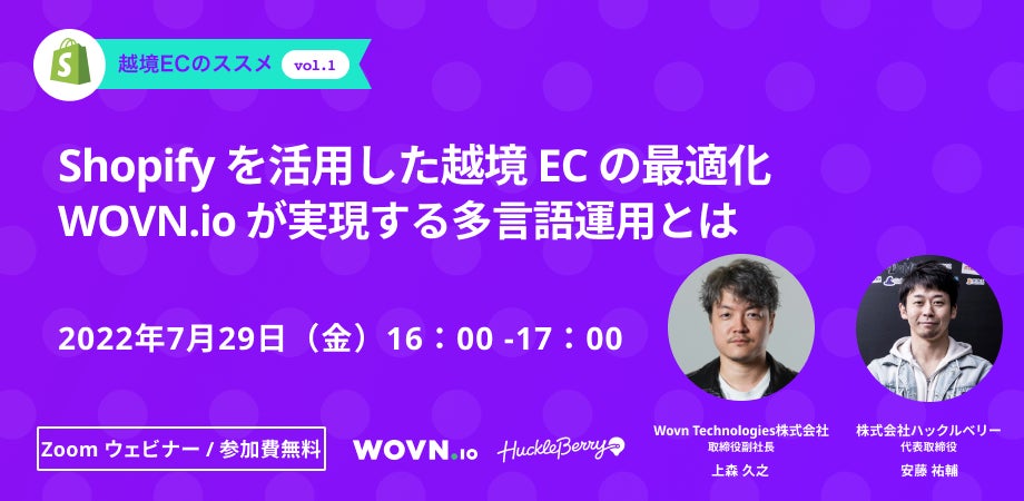 今回のセミナーは、「越境ECをはじめるにはどうしたらいいか?」というテーマで、様々なサイト・サービスに多言語化ソリューションを提供してきたWOVNと、Shopify Expertとして様々なECサイトを構築してきたハックルベリーの2社で開催。越境ECの構築・展開だけでなく、運用の中でも課題として多く挙げられる「多言語展開」についてのノウハウもお話いたします。