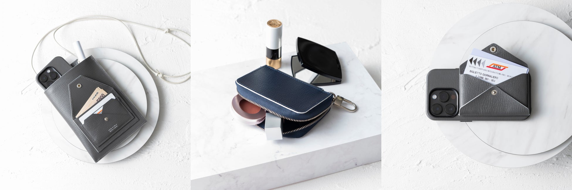 「第一弾で販売したiPhoneケース、ミニウォレット、キーケースをご購入いただいた方にもさらに楽しんでいただけるように、お揃いの色で、肩掛けできるお財布付きのスマホケースと、そこに装着できるミニマムなメイク道具も持ち歩けるようなポーチが作りたかったんです。」と滝沢さん。