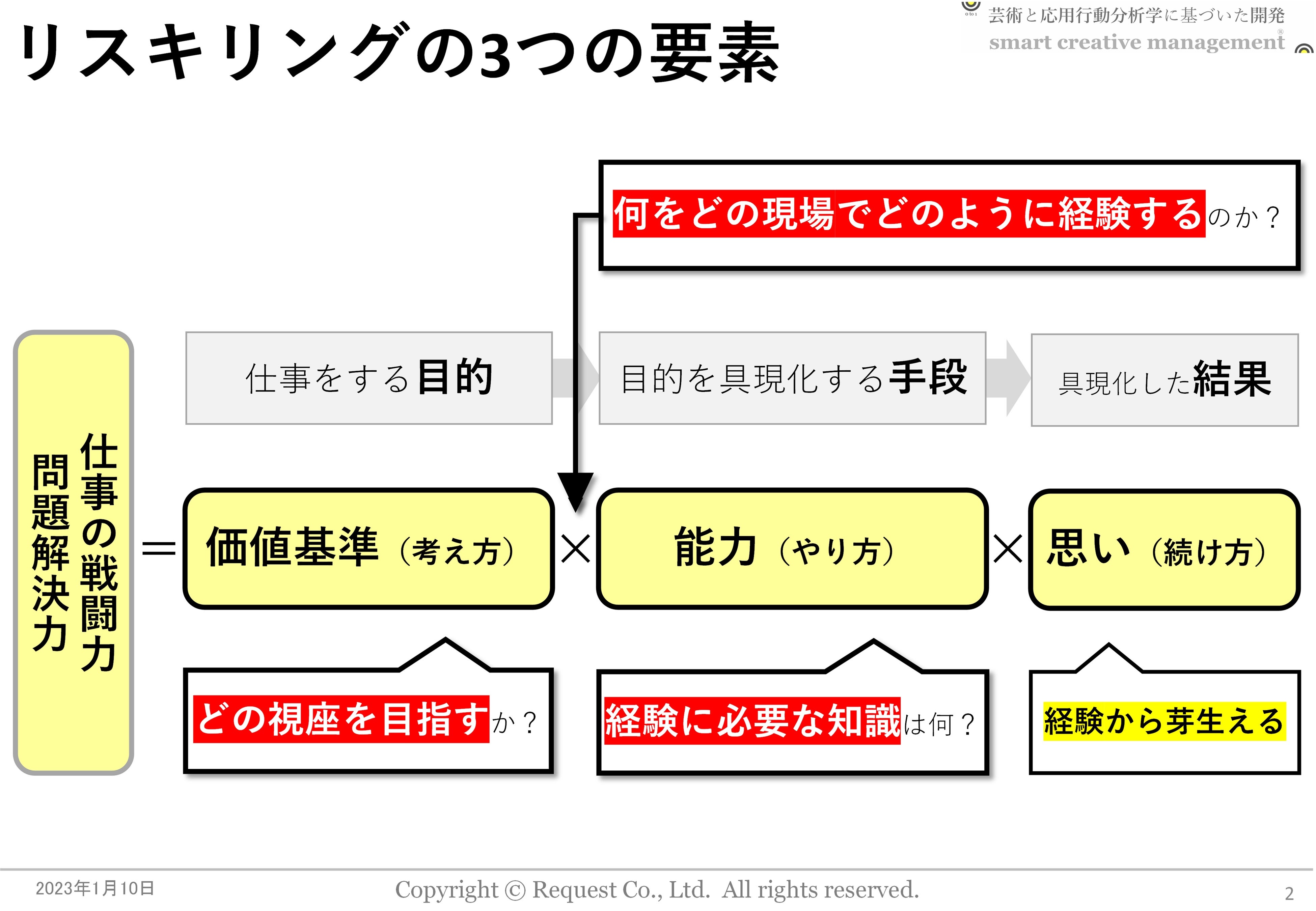 これを導入時に枠組みとして示す必要がある。各自の経験から「プロセス」「具体的」で対応してしまっては、リスキリングの1stステップに入ることができない。
