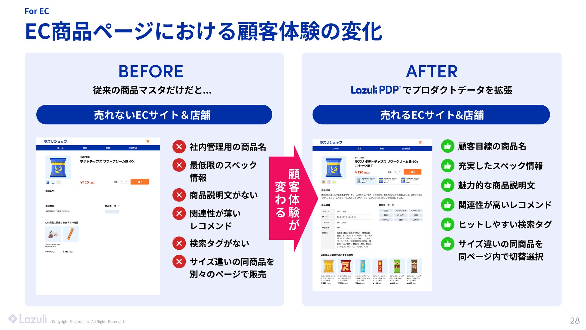 Lazuli株式会社(本社:東京都港区、代表取締役:萩原 静厳、以下Lazuli)が開発・提供する、AI技術を活用したSaaSのクラウド型商品マスタ「Lazuli PDP」が、株式会社ビックカメラ(本社:東京都豊島区、代表取締役社長 秋保 徹、以下ビックカメラ)が運営するビックカメラのインターネット総合通販サイト「ビックカメラ・ドットコム」に、2024年9月より商品情報を 拡充、整理するためのAIソリューションとして採用されました。