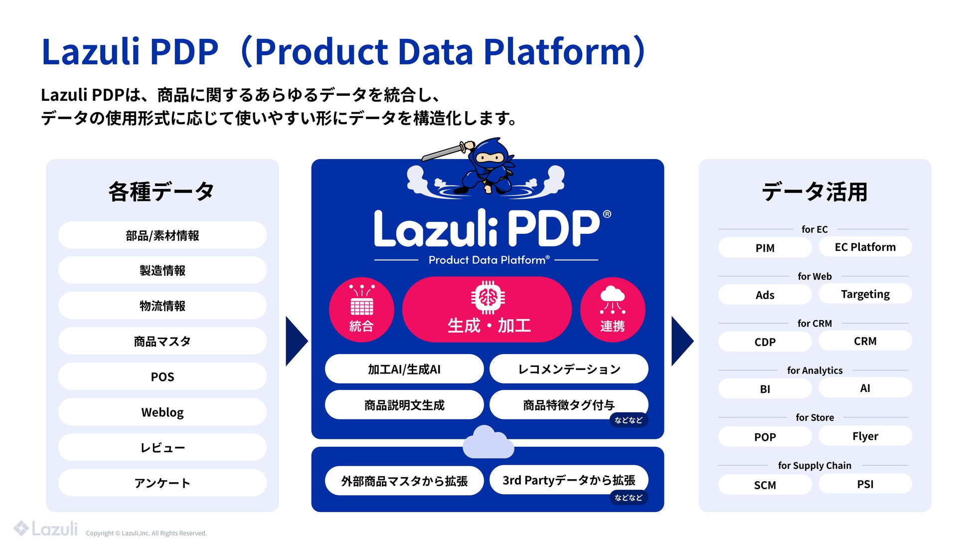 Lazuliが開発、提供する「Lazuli PDP」は、複数の外部データベースに点在していた商品情報を一括して管理し、データを活用しやすい形に整備、連携するためのクラウドサービスです。製造業者や小売業者などが保有する多様な商品マスタデータを、AIを活用して名寄せし、製品の特徴からメタタグの付与や関連付けを行います。これらの情報が「Lazuli PDP」を通じて、ユーザーに提供されます。