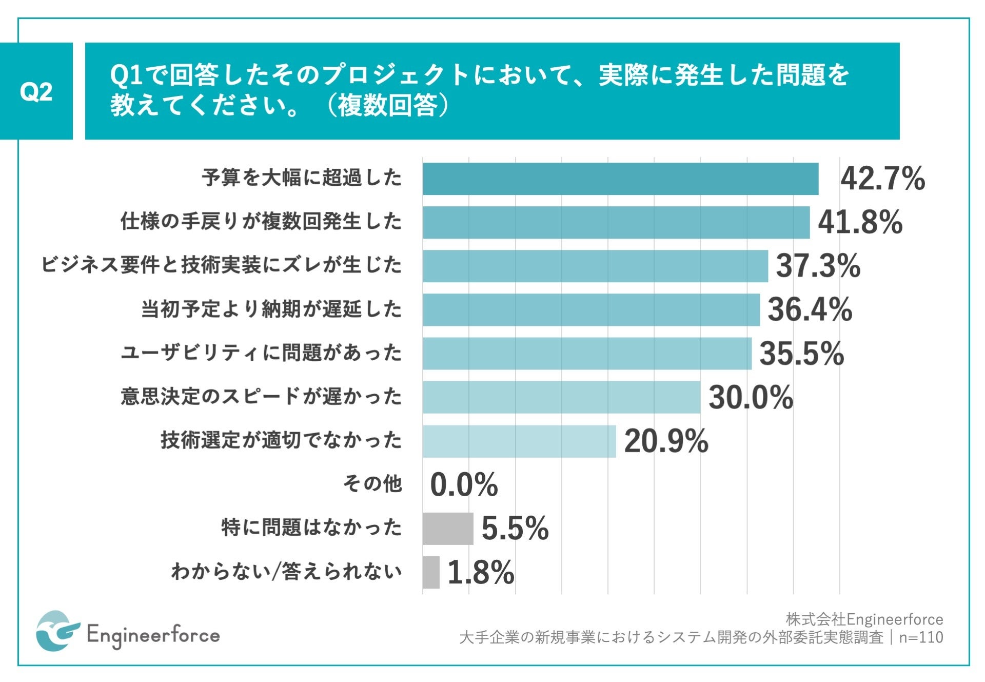 「Q2.Q1で回答したそのプロジェクトにおいて、実際に発生した問題を教えてください。(複数回答)」(n=110)と質問したところ、「予算を大幅に超過した」が42.7%、「仕様の手戻りが複数回発生した」が41.8%、「ビジネス要件と技術実装にズレが生じた」が37.3%という回答となりました。