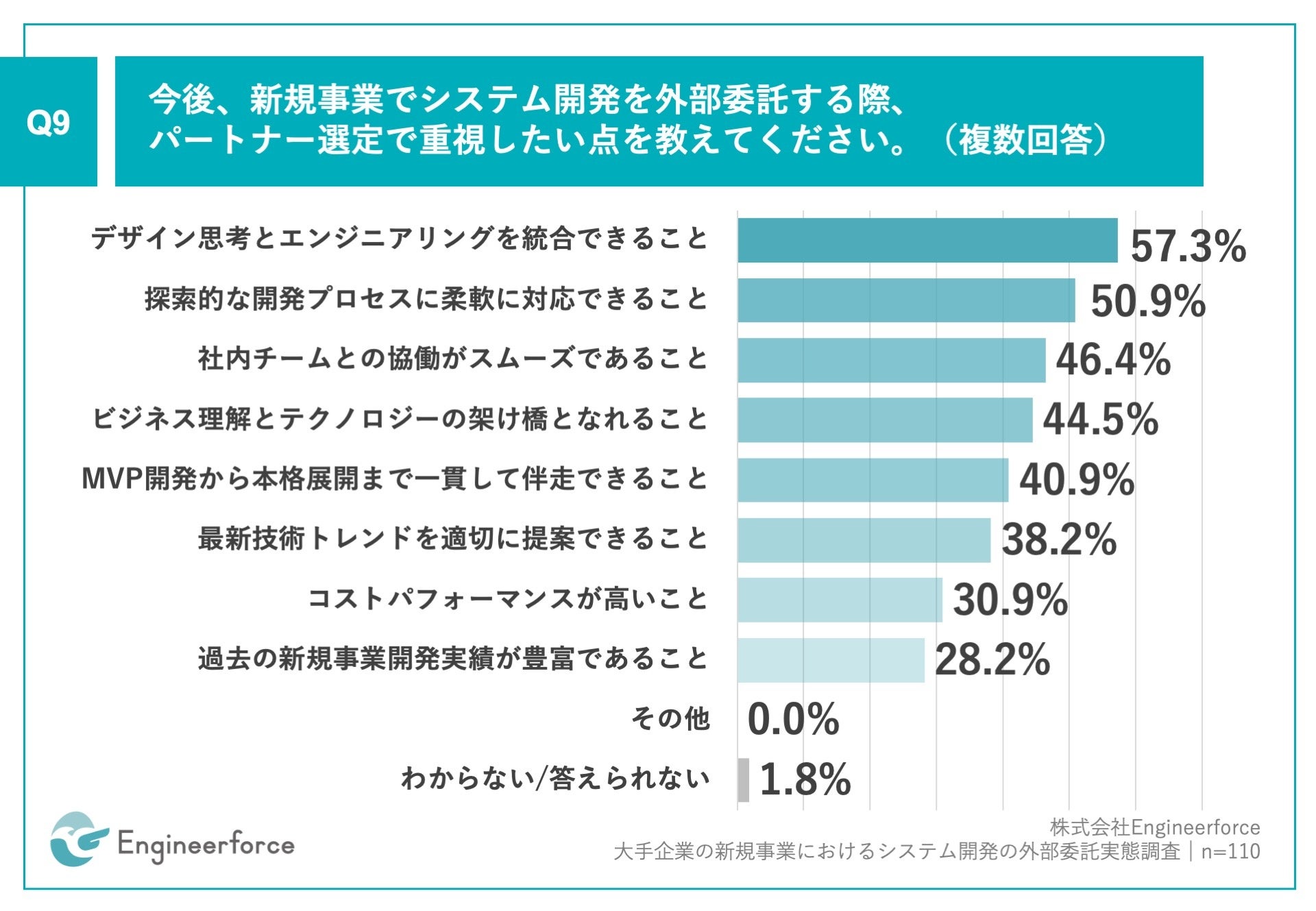「Q9.今後、新規事業でシステム開発を外部委託する際、パートナー選定で重視したい点を教えてください。(複数回答)」(n=110)と質問したところ、「デザイン思考とエンジニアリングを統合できること」が57.3%、「探索的な開発プロセスに柔軟に対応できること」が50.9%、「社内チームとの協働がスムーズであること」が46.4%という回答となりました。