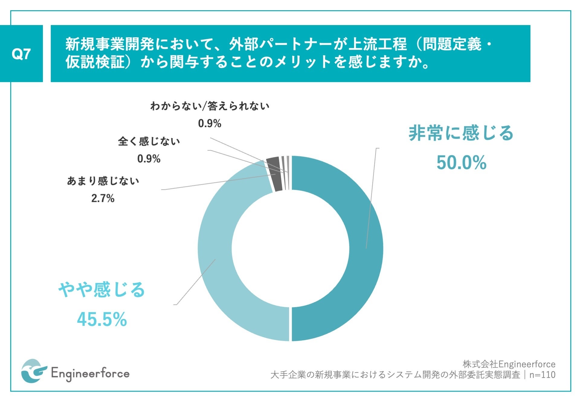 「Q7.新規事業開発において、外部パートナーが上流工程(問題定義・仮説検証)から関与することのメリットを感じますか。」(n=110)と質問したところ、「非常に感じる」が50.0%、「やや感じる」が45.5%という回答となりました。