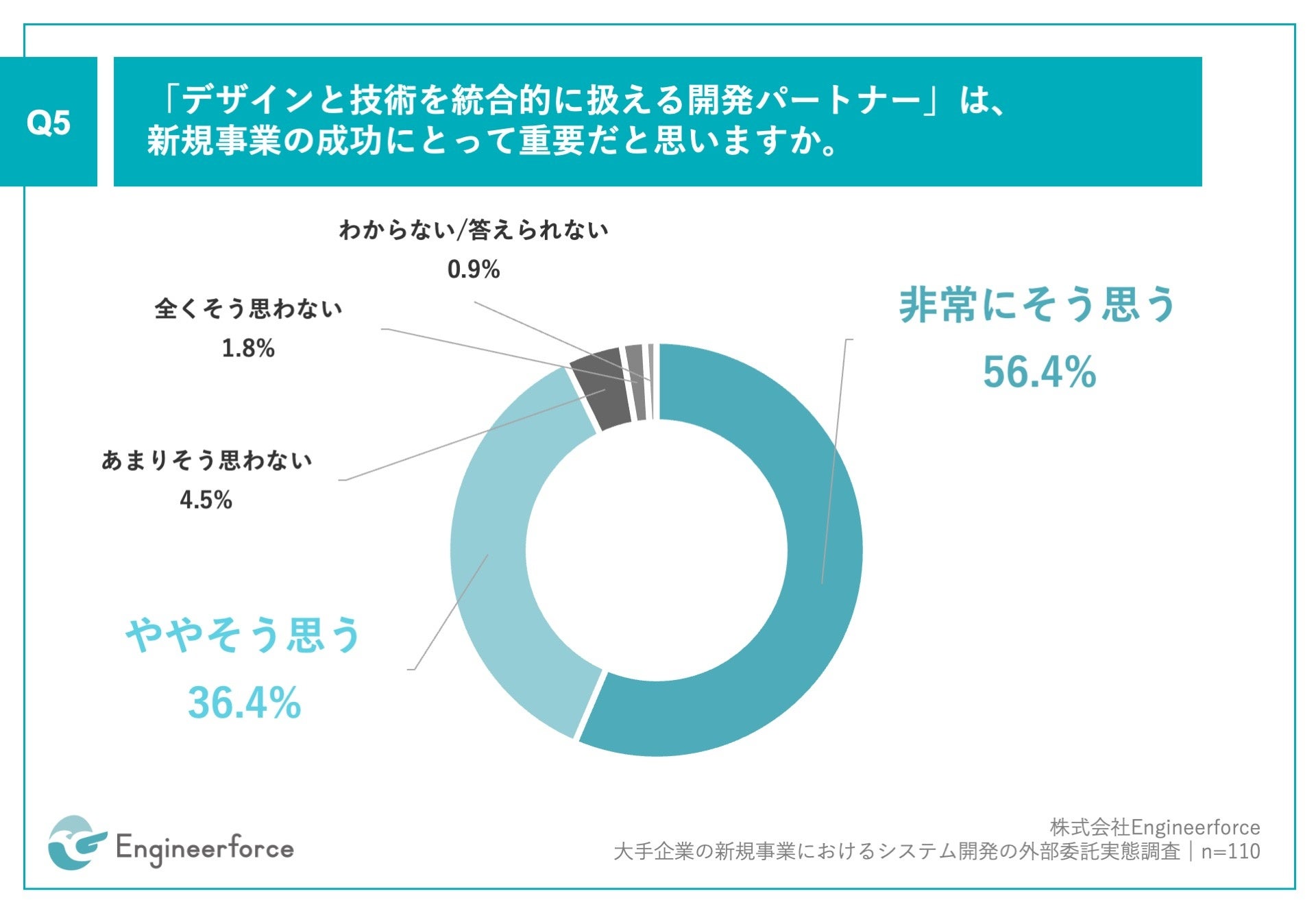 「Q5.「デザインと技術を統合的に扱える開発パートナー」は、新規事業の成功にとって重要だと思いますか。」(n=110)と質問したところ、「非常にそう思う」が56.4%、「ややそう思う」が36.4%という回答となりました。