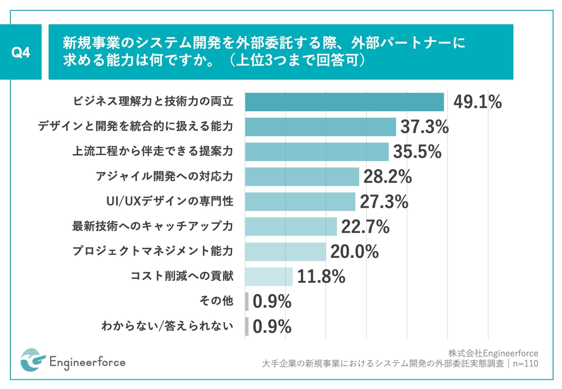 「Q4.新規事業のシステム開発を外部委託する際、外部パートナーに求める能力は何ですか。(上位3つまで回答可)」(n=110)と質問したところ、「ビジネス理解力と技術力の両立」が49.1%、「デザインと開発を統合的に扱える能力」が37.3%、「上流工程から伴走できる提案力」が35.5%という回答となりました。