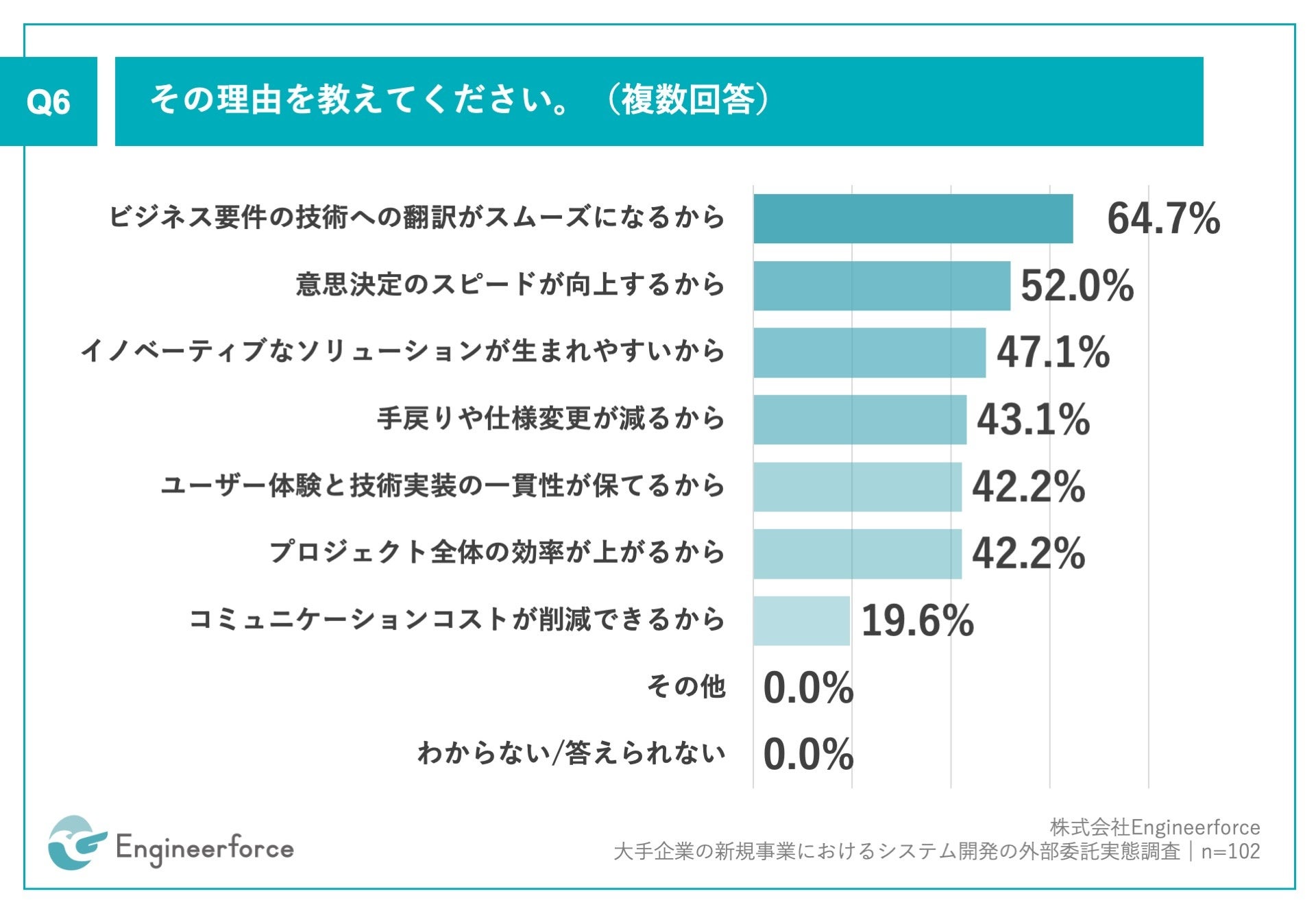Q5で「非常にそう思う」「ややそう思う」と回答した方に、「Q6.その理由を教えてください。(複数回答)」(n=102)と質問したところ、「ビジネス要件の技術への翻訳がスムーズになるから」が64.7%、「意思決定のスピードが向上するから」が52.0%、「イノベーティブなソリューションが生まれやすいから」が47.1%という回答となりました。