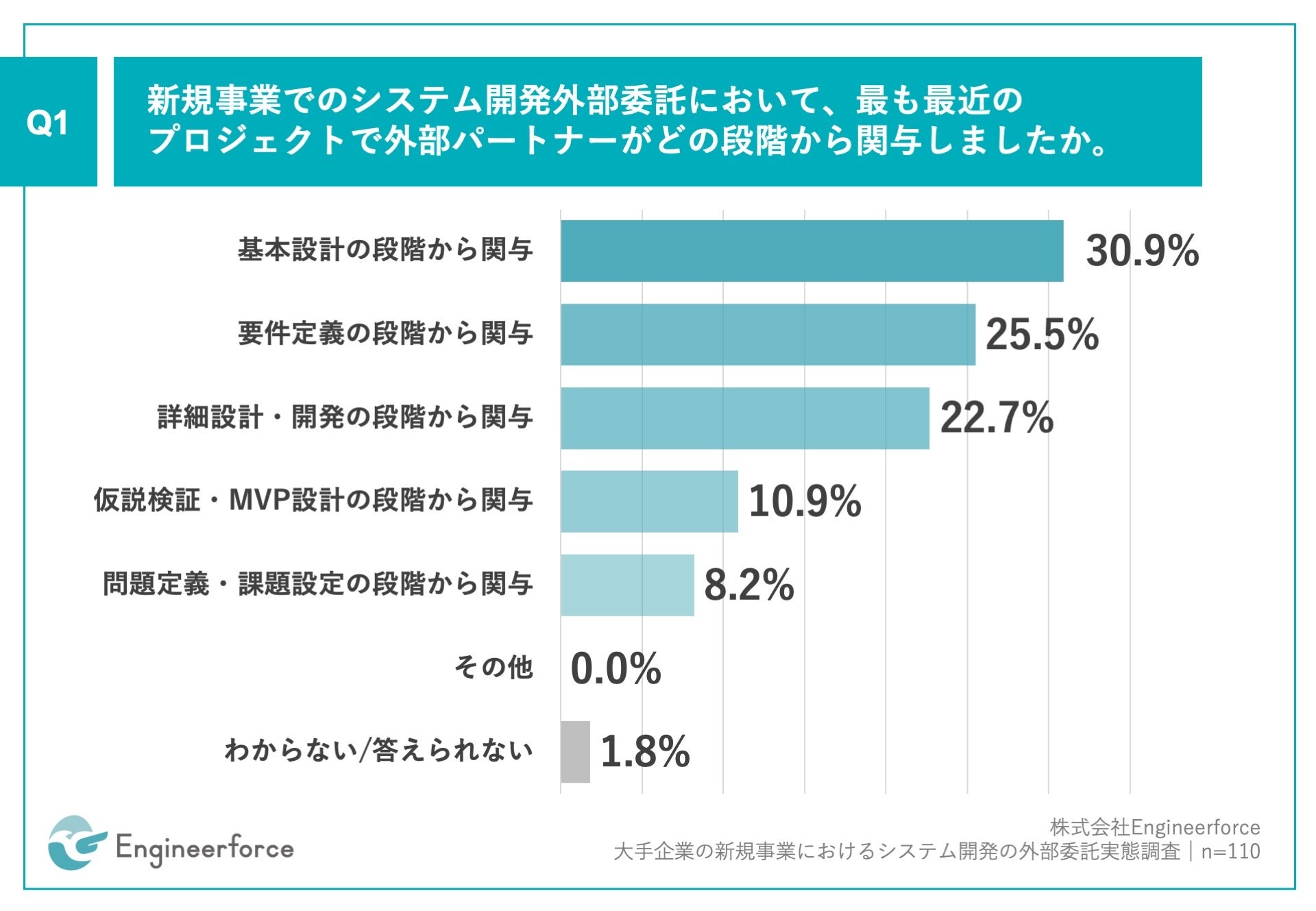 「Q1.新規事業でのシステム開発外部委託において、最も最近のプロジェクトで外部パートナーがどの段階から関与しましたか。」(n=110)と質問したところ、「基本設計の段階から関与」が30.9%、「詳細設計・開発の段階から関与」が22.7%という回答となりました。