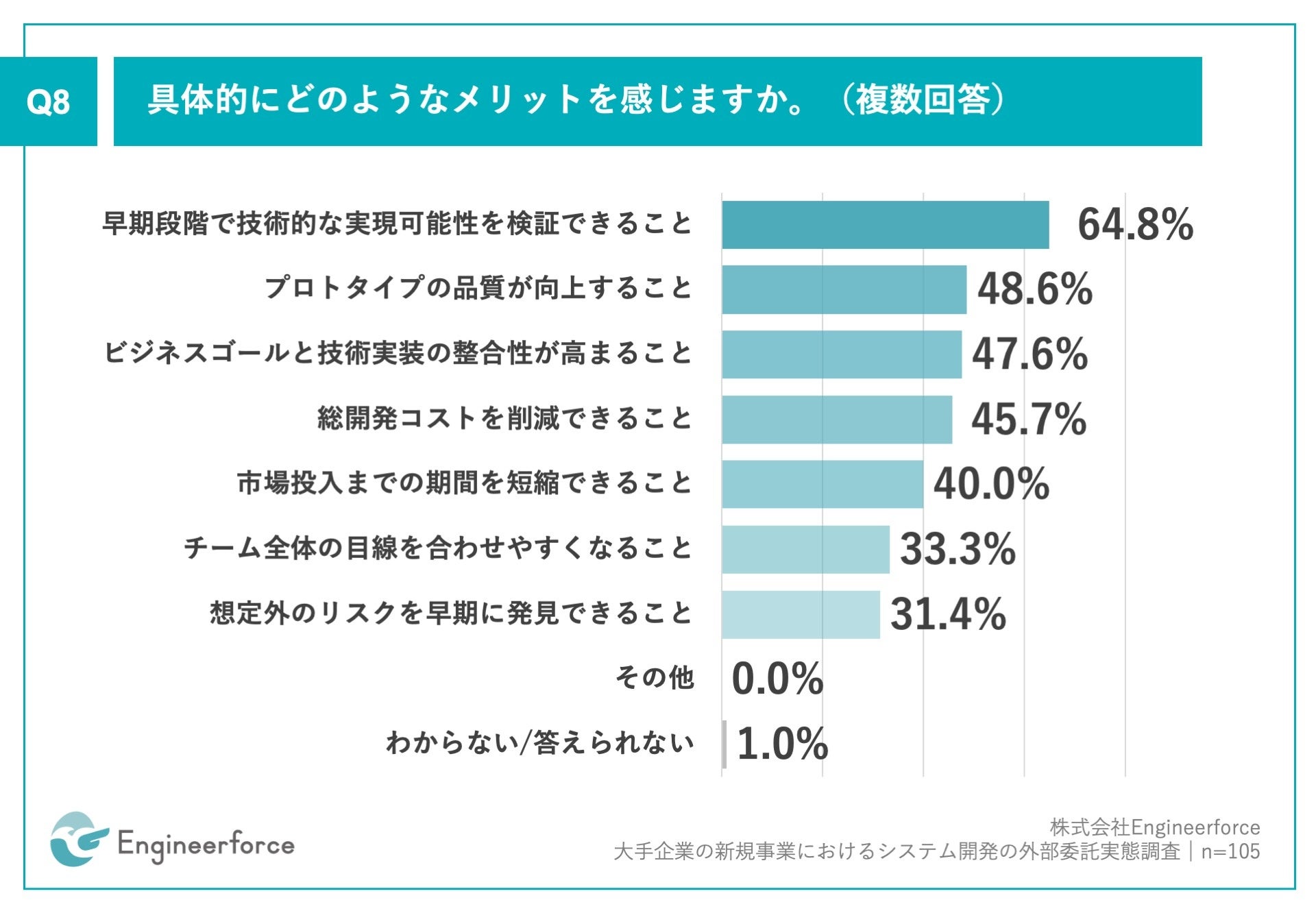 Q7で「非常に感じる」「やや感じる」と回答した方に、「Q8.具体的にどのようなメリットを感じますか。(複数回答)」(n=105)と質問したところ、「早期段階で技術的な実現可能性を検証できること」が64.8%、「プロトタイプの品質が向上すること」が48.6%、「ビジネスゴールと技術実装の整合性が高まること」が47.6%という回答となりました。