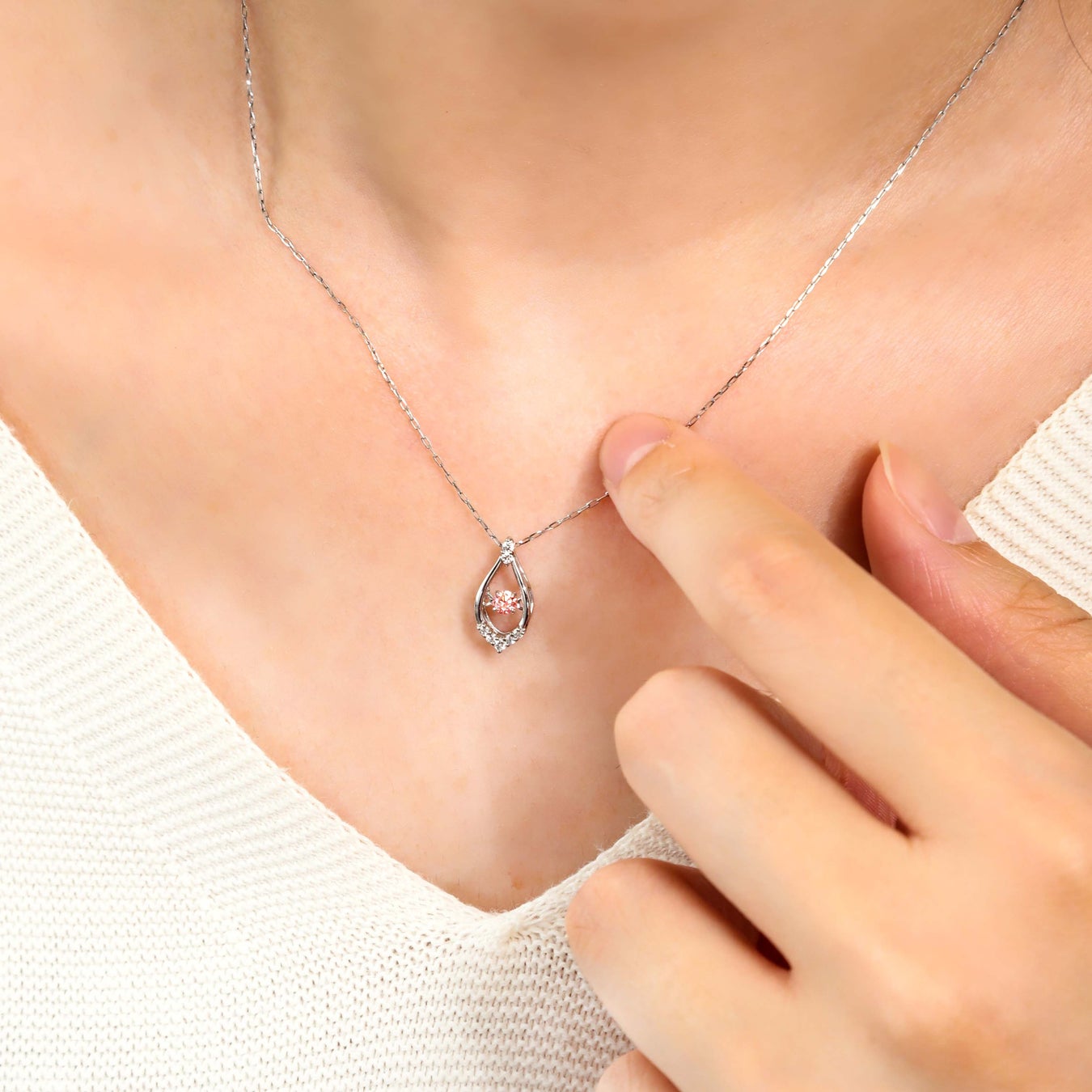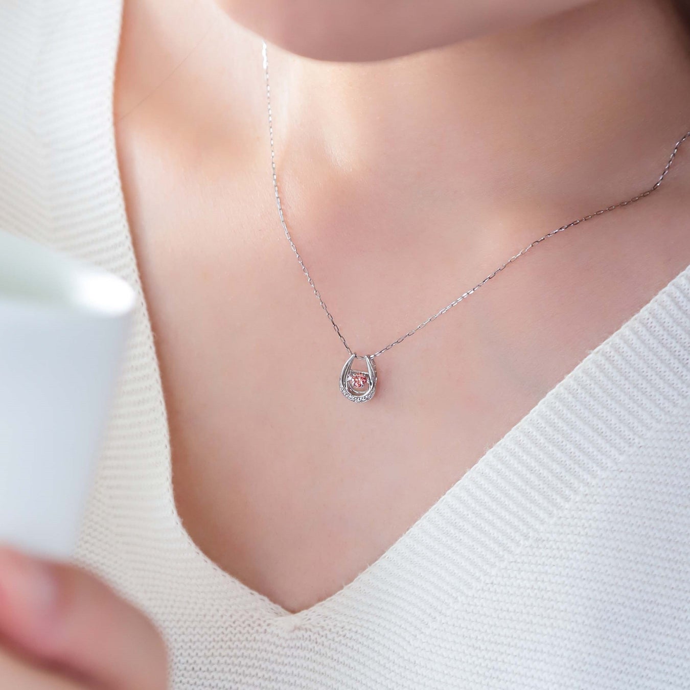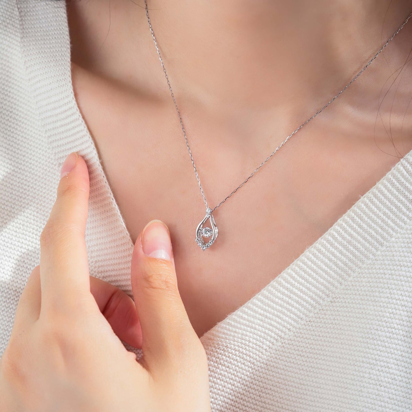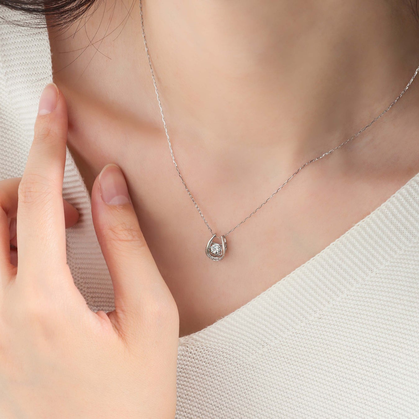 また、人は動いているモノに目を奪われる習性があり、このネックレスを着けているだけで揺らめくダイヤモンドが胸元を主張し、毎日着けるのが楽しくなるジュエリーです。