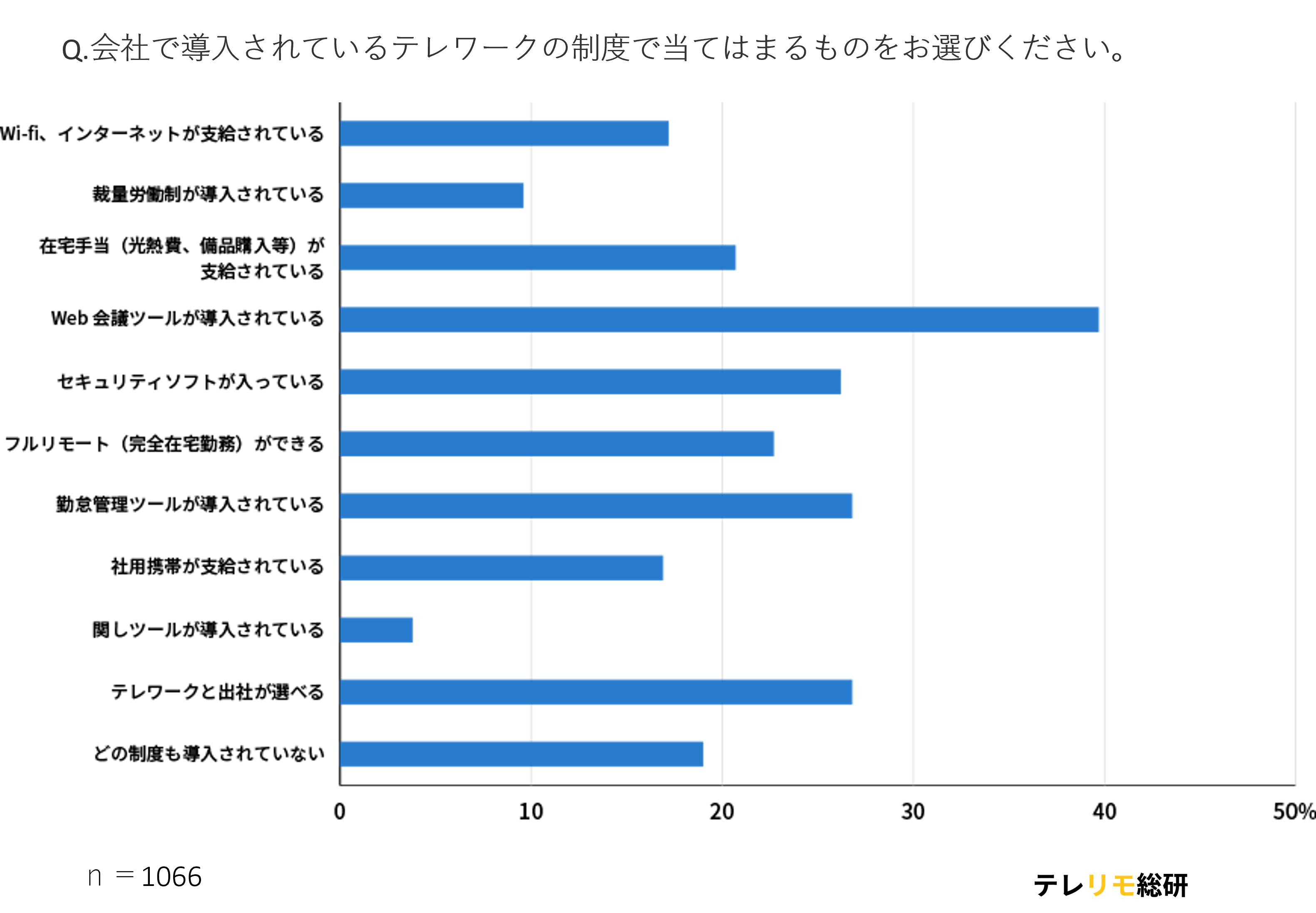 一方で、在宅手当の支給は約20%、Wi-fi,インターネットの支給は約17%などの結果から、+αの制度導入に至っているところはまだまだ少ないということが分かります。また、どの制度も導入されていないという回答が19%という結果も出ており、テレワークという概念はあるが整備がほとんど進んでいないような企業も存在しているようです。