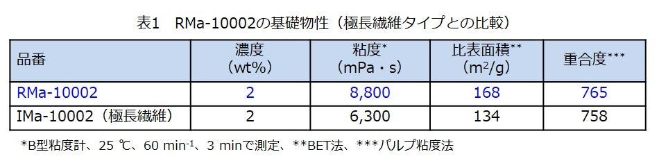 粘度、比表面積、重合度の測定結果を、既存のIMa(極長繊維)タイプと比較して示します(表1)。一般的に、繊維が長く細いほど分散液の粘度は高く、繊維が細いほど比表面積は大きく、また繊維が長いほど重合度が大きくなります。RMaはいずれの物性も高い数値を示しているため、IMaよりも長く細いと言えます