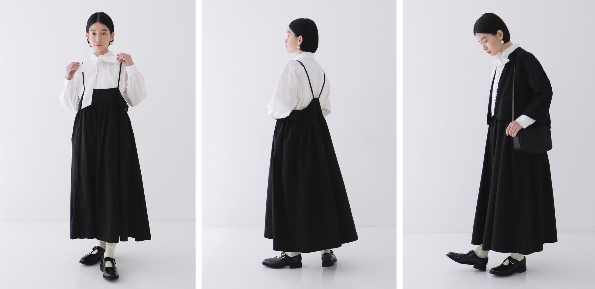 アジャスターで丈の調整ができるジャンパースカート。紐を短くしてキャミワンピース、長くしてマキシスカートなど、着こなしの幅が大きく広がるアイテムです。同じシリーズのジャケットとあわせたセットアップでの着こなしもおすすめです。