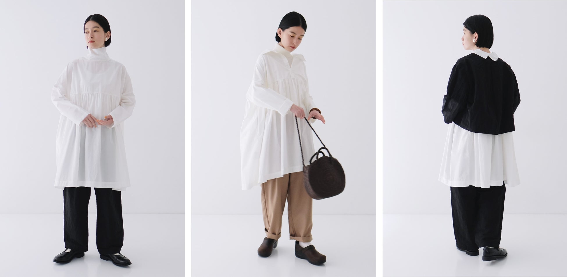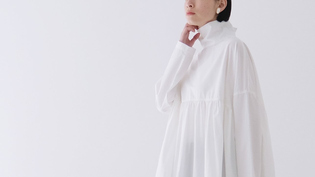 前後着用可能な2way仕様。ボタンを留めてハイネック、釦を開けてオープンカラー、襟を折り曲げロールカラー。様々な着こなしがお楽しみ頂ける1枚です。ハリ感のあるコットンタイプライターでお作りすることで清潔感やきちんと感をより引き立てるブラウスに仕上げました。