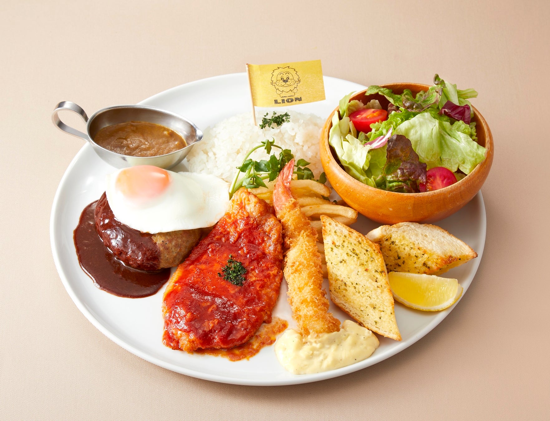 (目玉焼きハンバーグ/ポークチャップ/海老フライ/ガーリックトーストライオンオリジナルカレー/フライドポテト/ライス/サラダ)
