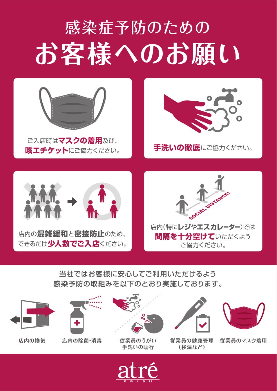 アトレでは、お客様、従業員及び関係者の皆様の安全性を考慮し、新型コロナウイルス感染拡大防止の為の対策を講じます。また、来店されるお客様へのご協力のお願いがございます。